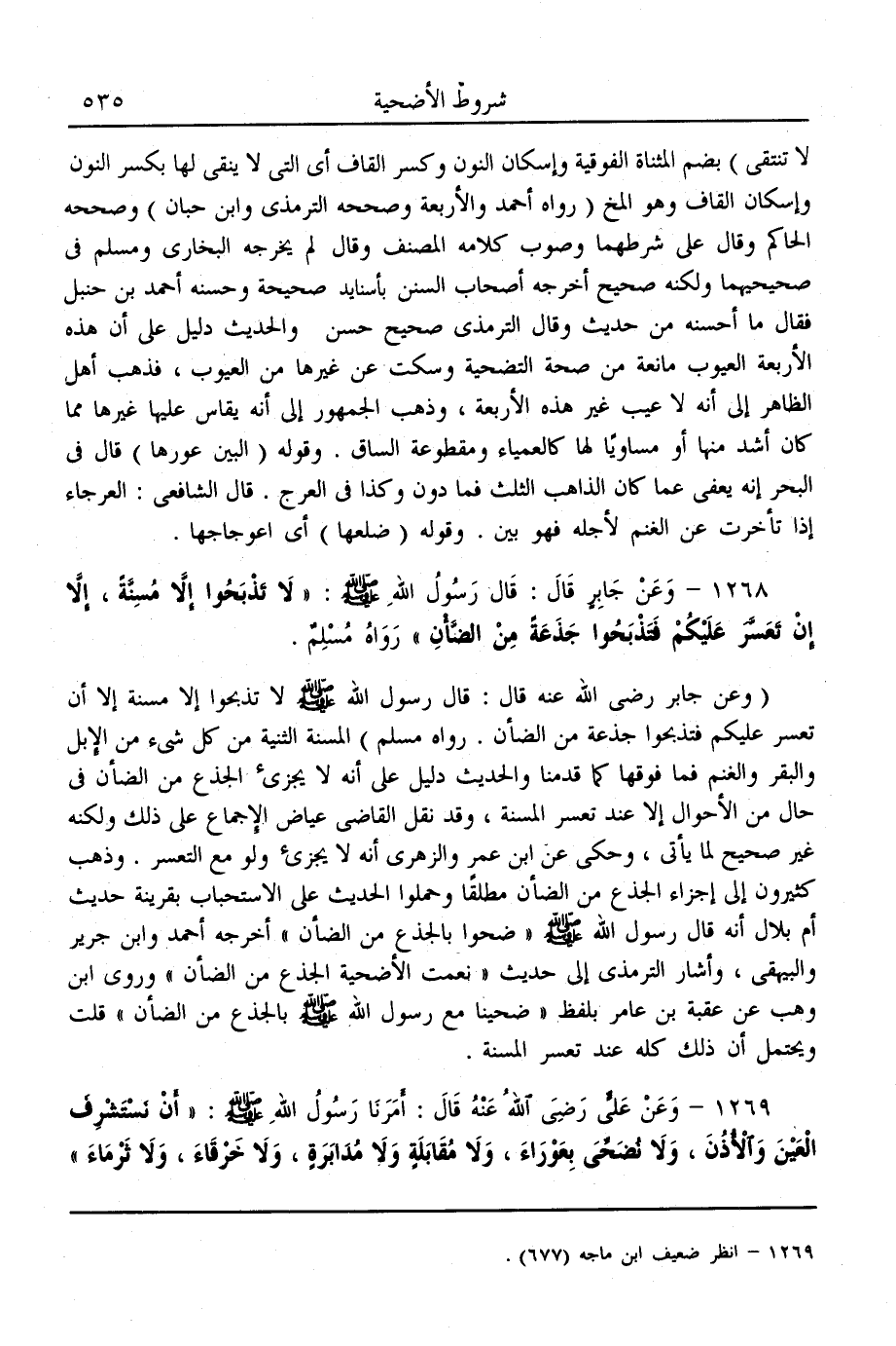 (1268) - وَعَنْ جَابِرٍ قَالَ: قَالَ رَسُولُ اللَّهِ - صَلَّى اللَّهُ عَلَيْهِ وَسَلَّمَ -: «لَا تَذْبَحُوا إلَّا مُسِنَّةً، إلَّا إنْ تَعَسَّرَ عَلَيْكُمْ فَتَذْبَحُوا جَذَعَةً مِنْ الضَّأْنِ» رَوَاهُ مُسْلِمٌ.