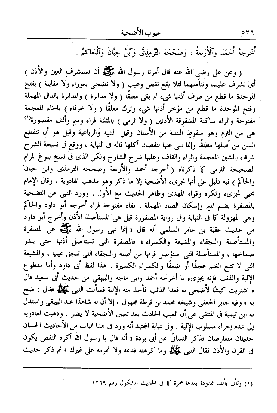 ـــــــــــــــــــــــــــــQ (وَعَنْ عَلِيٍّ - رَضِيَ اللَّهُ عَنْهُ - قَالَ «أَمَرَنَا رَسُولُ اللَّهِ - صَلَّى اللَّهُ عَلَيْهِ وَسَلَّمَ - أَنْ نَسْتَشْرِقَ الْعَيْنَ وَالْأُذُنَ» أَيْ نُشْرِفَ عَلَيْهِمَا وَنَتَأَمَّلَهُمَا لِئَلَّا يَقَعَ نَقْصٌ وَعَيْبٌ ( «وَلَا نُضَحِّيَ بِعَوْرَاءَ وَلَا مُقَابَلَةٍ» بِفَتْحِ الْمُوَحَّدَةِ مَا قُطِعَ مِنْ طَرَفِ أُذُنِهَا شَيْءٌ ثُمَّ بَقِيَ مُعَلَّقًا (وَلَا مُدَابَرَةٍ) وَالْمُدَابَرَةُ بِالدَّالِ الْمُهْمَلَةِ وَفَتْحِ الْمُوَحَّدَةِ مَا قُطِعَ مِنْ مُؤَخِّرِ أُذُنِهَا شَيْءٌ وَتُرِكَ مُعَلَّقًا (وَلَا خَرْقَاءَ) بِالْخَاءِ الْمُعْجَمَةِ مَفْتُوحَةً وَالرَّاءِ سَاكِنَةً الْمَشْقُوقَةُ الْأُذُنَيْنِ (وَلَا ثَرَمَى) بِالْمُثَلَّثَةِ فَرَاءٍ وَمِيمٍ وَأَلْفٍ مَقْصُورَةٍ هِيَ مِنْ الثَّرَمِ وَهِيَ سُقُوطُ السِّنَّةِ مِنْ الْأَسْنَانِ وَقِيلَ الثَّنِيَّةُ وَالرُّبَاعِيَّةُ وَقِيلَ هُوَ أَنْ تَنْقَطِعَ السِّنُّ مِنْ أَصْلِهَا مُطْلَقًا وَإِنَّمَا نَهَى عَنْهَا لِنُقْصَانِ أَكْلِهَا قَالَهُ فِي النِّهَايَةِ، وَوَقَعَ فِي نُسْخَةِ الشَّرْحِ شَرْقَاءَ بِالشِّينِ الْمُعْجَمَةِ وَالرَّاءِ وَالْقَافِ وَعَلَيْهَا شَرْحُ الشَّارِحِ وَلَكِنَّ الَّذِي فِي نُسَخِ بُلُوغِ الْمَرَامِ الصَّحِيحَةُ الثَّرَمَى كَمَا ذَكَرْنَاهُ (أَخْرَجَهُ أَحْمَدُ وَالْأَرْبَعَةُ وَصَحَّحَهُ التِّرْمِذِيُّ وَابْنُ حِبَّانَ وَالْحَاكِمُ) فِيهِ دَلِيلٌ عَلَى أَنَّهَا تُجْزِئُ الْأُضْحِيَّةُ إلَّا مَا ذُكِرَ وَهُوَ مَذْهَبُ الْهَادَوِيَّةِ، وَقَالَ الْإِمَامُ يَحْيَى تُجْزِئُ وَتَكْرَهُ وَقَوَّاهُ الْمَهْدِيُّ وَظَاهِرُ الْحَدِيثِ مَعَ الْأَوَّلِ. وَوَرَدَ النَّهْيُ عَنْ التَّضْحِيَةِ بِالْمُصْفَرَّةِ بِضَمِّ الْمِيمِ وَإِسْكَانِ الصَّادِ الْمُهْمَلَةِ. فَفَاءٍ مَفْتُوحَةٍ فَرَاءٍ أَخْرَجَهُ أَبُو دَاوُد وَالْحَاكِمُ وَهِيَ الْمَهْزُولَةُ كَمَا فِي النِّهَايَةِ وَفِي رِوَايَةٍ الْمَصْفُورَةُ قِيلَ هِيَ الْمُسْتَأْصَلَةُ الْأُذُنِ وَأَخْرَجَ أَبُو دَاوُد مِنْ حَدِيثِ عُقْبَةَ بْنِ عَامِرٍ السُّلَمِيِّ أَنَّهُ قَالَ إنَّمَا «نَهَى رَسُولُ اللَّهِ - صَلَّى اللَّهُ عَلَيْهِ وَسَلَّمَ - عَنْ الْمُصَفَّرَةِ وَالْمُسْتَأْصَلَة وَالْبَخْقَاءِ وَالْمُشَيَّعَةِ وَالْكَسْرَاءِ» فَالْمُصْفَرَّةُ: الَّتِي تُسْتَأْصَلُ أُذُنُهَا حَتَّى يَبْدُوَ صِمَاخُهَا، وَالْمُسْتَأْصَلَة الَّتِي اُسْتُؤْصِلَ قَرْنُهَا مِنْ أَصْلِهِ وَالنَّجْقَاءُ الَّتِي تُبْخَقُ عَيْنُهَا، وَالْمُشَيَّعَةُ الَّتِي لَا تَتْبَعُ الْغَنَمَ عَجَفًا أَوْ ضَعْفًا وَالْكَسْرَاءُ الْكَسِيرَةُ. هَذَا لَفْظُ أَبِي دَاوُد وَأَمَّا مَقْطُوعُ الْأَلْيَةِ وَالذَّنَبِ فَإِنَّهُ يُجْزِئُ لِمَا أَخْرَجَهُ أَحْمَدُ وَابْنُ مَاجَهْ وَالْبَيْهَقِيُّ مِنْ حَدِيثِ أَبِي سَعِيدٍ قَالَ " اشْتَرَيْت كَبْشًا لِأُضَحِّيَ بِهِ فَعَدَا الذِّئْبُ فَأَخَذَ مِنْهُ الْأَلْيَةَ فَسَأَلْت النَّبِيَّ - صَلَّى اللَّهُ عَلَيْهِ وَسَلَّمَ - فَقَالَ: ضَحِّ بِهِ " وَفِيهِ جَابِرٌ الْجُعْفِيُّ وَشَيْخُهُ مُحَمَّدُ بْنُ قَرَظَةَ مَجْهُولٌ، إلَّا أَنَّهُ لَهُ شَاهِدٌ عِنْدَ الْبَيْهَقِيّ وَاسْتَدَلَّ بِهِ ابْنُ تَيْمِيَّةَ فِي الْمُنْتَقَى عَلَى أَنَّ الْعَيْبَ الْحَادِثَ بَعْدَ تَعْيِينِ الْأُضْحِيَّةِ لَا يَضُرُّ. وَذَهَبَتْ الْهَادَوِيَّةُ إلَى عَدَمِ إجْزَاءِ مَسْلُوبِ الْأَلْيَةِ. وَفِي نِهَايَةِ الْمُجْتَهِدِ أَنَّهُ وَرَدَ فِي هَذَا الْبَابِ مِنْ الْأَحَادِيثِ الْحِسَانِ حَدِيثَانِ مُتَعَارِضَانِ فَذَكَر النَّسَائِيّ عَنْ «أَبِي بُرْدَةَ أَنَّهُ قَالَ يَا رَسُولَ اللَّهِ أَكْرَهُ النَّقْصَ يَكُونُ فِي