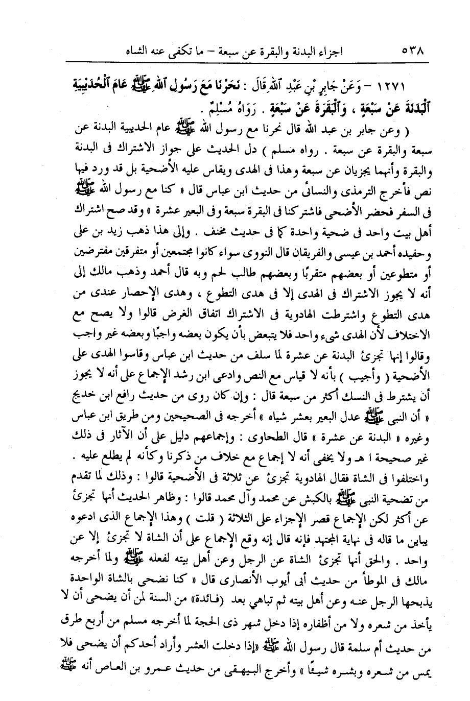 (وَعَنْ جَابِرِ بْنَ عَبْدِ اللَّهِ قَالَ «نَحَرْنَا مَعَ رَسُولِ اللَّهِ - صَلَّى اللَّهُ عَلَيْهِ وَسَلَّمَ - عَامَ الْحُدَيْبِيَةِ الْبَدَنَةَ عَنْ سَبْعَةٍ وَالْبَقَرَةَ عَنْ سَبْعَةٍ» . رَوَاهُ مُسْلِمٌ) دَلَّ الْحَدِيثُ عَلَى جَوَازِ الِاشْتِرَاكِ فِي الْبَدَنَةِ وَالْبَقَرَةِ وَأَنَّهُمَا يُجْزِيَانِ عَنْ سَبْعَةٍ وَهَذَا فِي الْهَدْيِ وَيُقَاسُ عَلَيْهِ الْأُضْحِيَّةُ بَلْ قَدْ وَرَدَ فِيهَا نَصٌّ فَأَخْرَجَ التِّرْمِذِيُّ وَالنَّسَائِيُّ مِنْ حَدِيثِ ابْنِ عَبَّاسٍ قَالَ «كُنَّا مَعَ رَسُولِ اللَّهِ - صَلَّى اللَّهُ عَلَيْهِ وَسَلَّمَ - فِي السَّفَرِ فَحَضَرَ الْأَضْحَى فَاشْتَرَكْنَا فِي الْبَقَرَةِ سَبْعَةٌ وَفِي الْبَعِيرِ عَشَرَةٌ» .