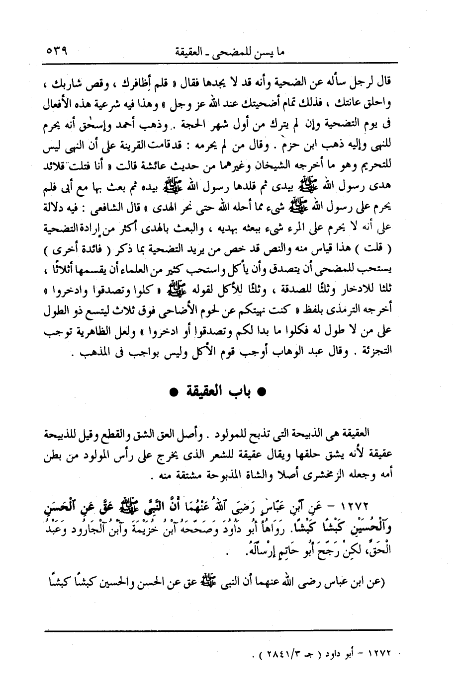 (1272) - عَنْ ابْنِ عَبَّاسٍ - رَضِيَ اللَّهُ عَنْهُمَا - «أَنَّ النَّبِيَّ - صَلَّى اللَّهُ عَلَيْهِ وَسَلَّمَ - عَقَّ عَنْ الْحَسَنِ وَالْحُسَيْنِ كَبْشًا كَبْشًا» . رَوَاهَا أَبُو دَاوُد وَصَحَّحَهُ ابْنُ خُزَيْمَةَ وَابْنُ الْجَارُودِ وَعَبْدُ الْحَقِّ، وَلَكِنْ رَجَّحَ أَبُو حَاتِمٍ إرْسَالَهُ.