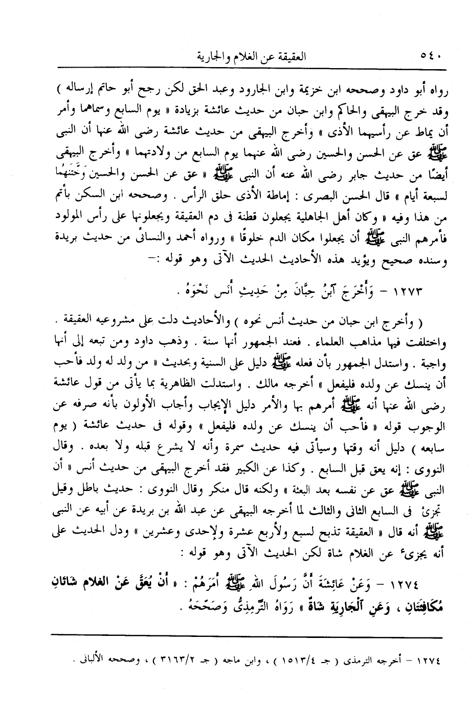 (1274) - وَعَنْ عَائِشَةَ «أَنَّ رَسُولَ اللَّهِ - صَلَّى اللَّهُ عَلَيْهِ وَسَلَّمَ - أَمَرَهُمْ: أَنْ يُعَقَّ عَنْ الْغُلَامِ شَاتَانِ مُكَافِئَتَانِ، وَعَنْ الْجَارِيَةِ شَاةٌ» رَوَاهُ التِّرْمِذِيُّ وَصَحَّحَهُ.