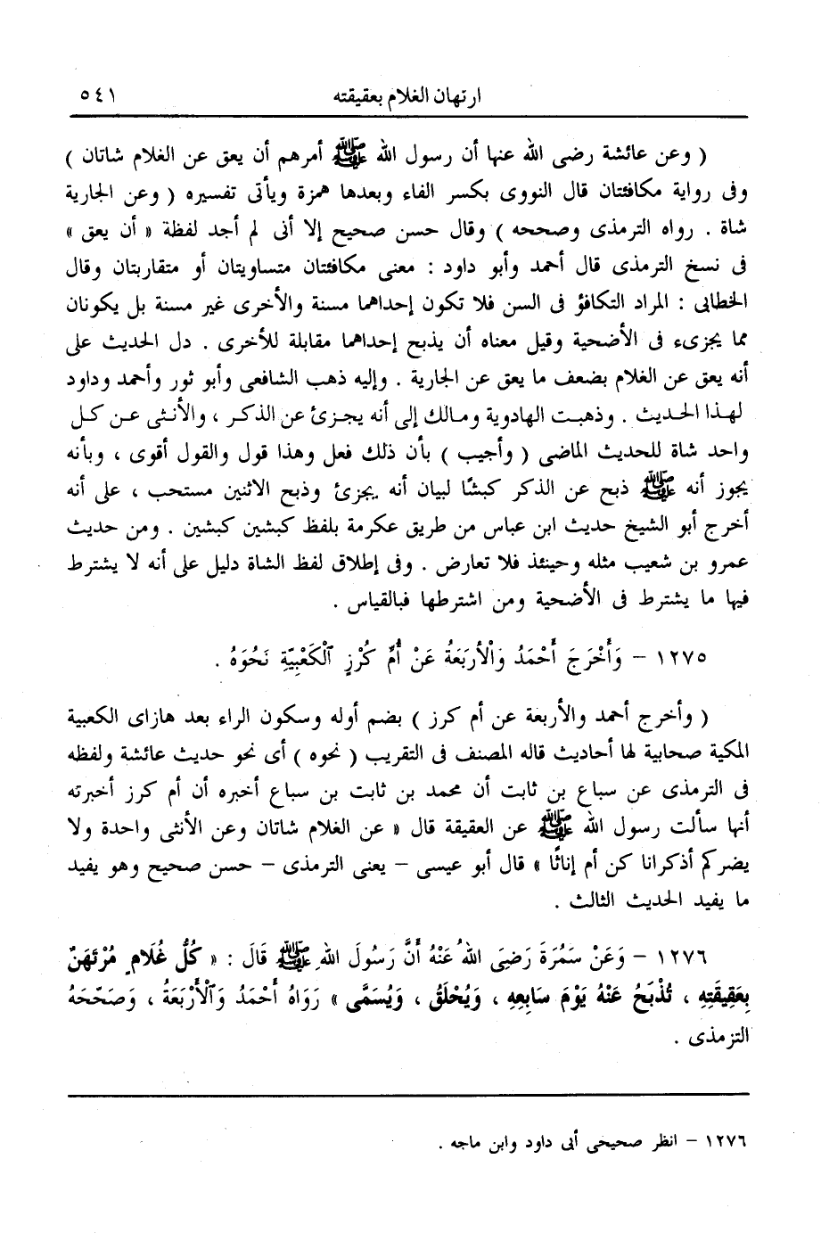 (1276) - وَعَنْ سَمُرَةَ - رَضِيَ اللَّهُ عَنْهُ - أَنَّ رَسُولَ اللَّهِ - صَلَّى اللَّهُ عَلَيْهِ وَسَلَّمَ - قَالَ: «كُلُّ غُلَامٍ مُرْتَهَنٌ بِعَقِيقَتِهِ تُذْبَحُ عَنْهُ يَوْمَ سَابِعِهِ، وَيُحْلَقُ، وَيُسَمَّى» رَوَاهُ أَحْمَدُ وَالْأَرْبَعَةُ، وَصَحَّحَهُ التِّرْمِذِيُّ.