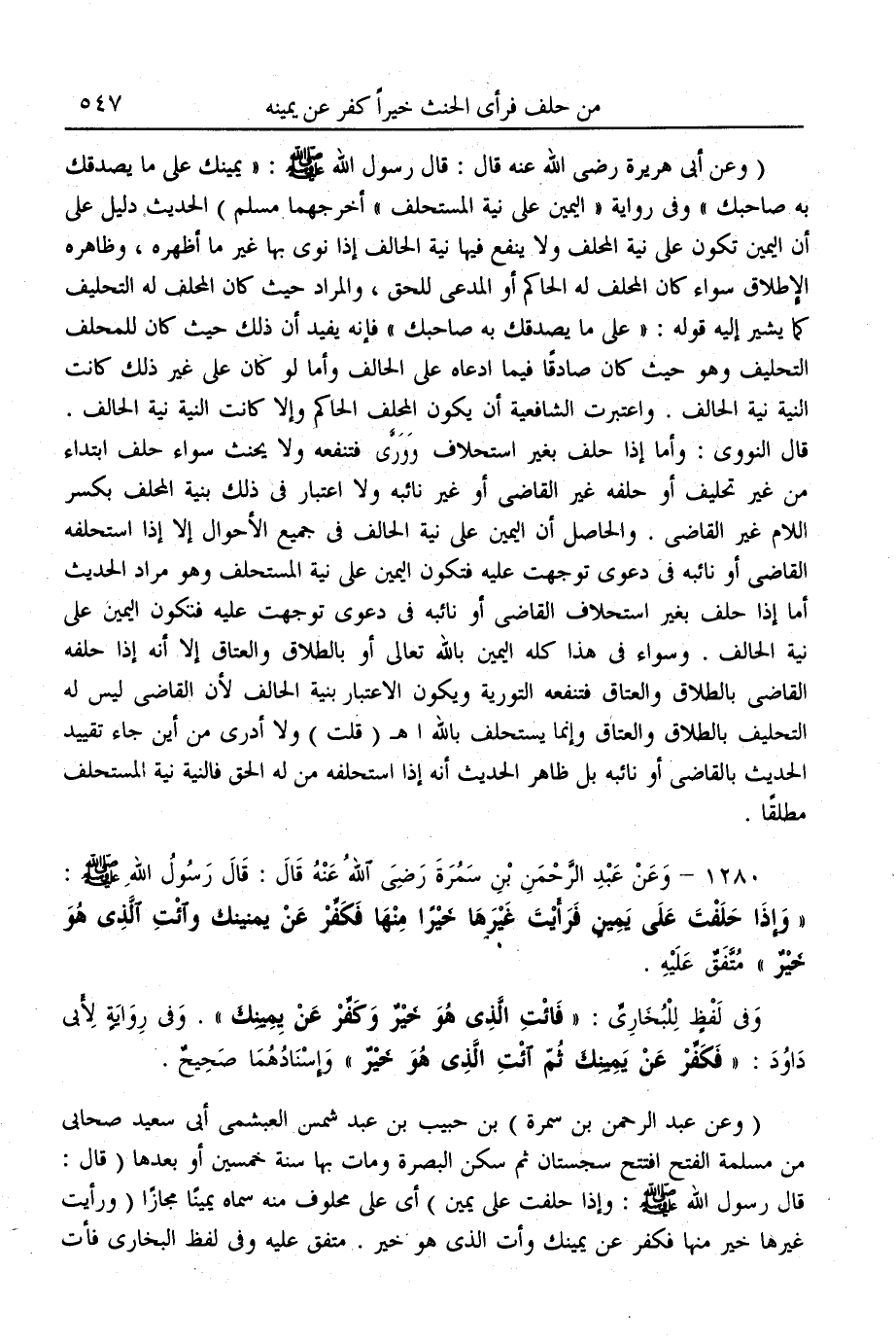 (1280) - وَعَنْ عَبْدِ الرَّحْمَنِ بْنِ سَمُرَةَ - رَضِيَ اللَّهُ عَنْهُ - قَالَ: قَالَ رَسُولُ اللَّهِ - صَلَّى اللَّهُ عَلَيْهِ وَسَلَّمَ -: «وَإِذَا حَلَفْت عَلَى يَمِينٍ فَرَأَيْت غَيْرَهَا خَيْرًا مِنْهَا فَكَفِّرْ عَنْ يَمِينِك وَأْتِ الَّذِي هُوَ خَيْرٌ» مُتَّفَقٌ عَلَيْهِ. وَفِي لَفْظِ لِلْبُخَارِيِّ: «فَائْتِ الَّذِي هُوَ خَيْرٌ وَكَفِّرْ عَنْ يَمِينِك» . وَفِي رِوَايَةٍ لِأَبِي دَاوُد: «فَكَفِّرْ عَنْ يَمِينِك ثُمَّ ائْتِ الَّذِي هُوَ خَيْرٌ» وَإِسْنَادُهُمَا صَحِيحٌ.