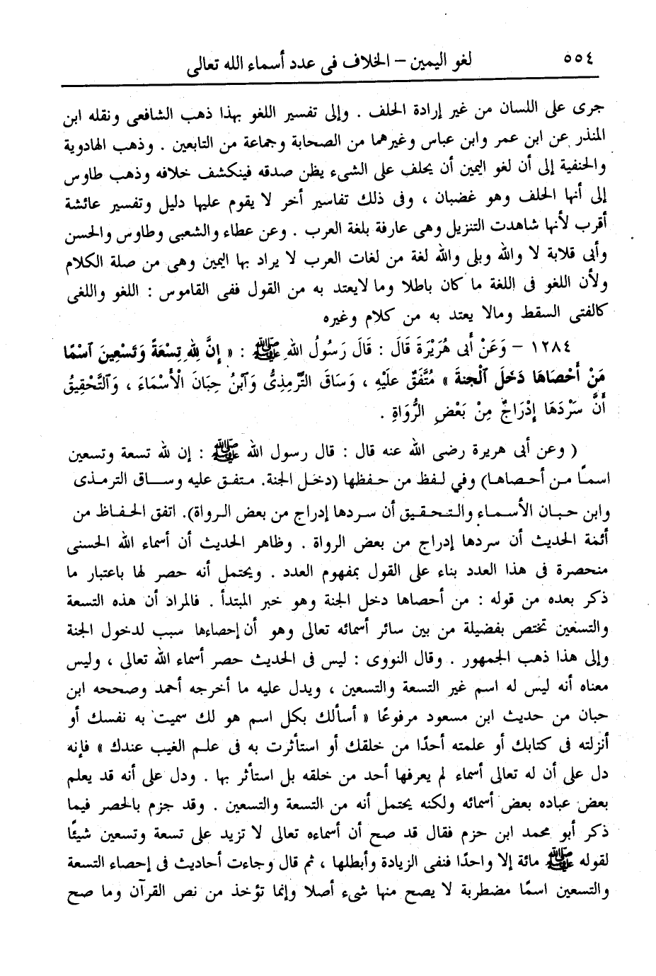 (1284) - وَعَنْ أَبِي هُرَيْرَةَ قَالَ: قَالَ رَسُولُ اللَّهِ - صَلَّى اللَّهُ عَلَيْهِ وَسَلَّمَ -: «إنَّ لِلَّهِ تِسْعَةً وَتِسْعِينَ اسْمًا مَنْ أَحْصَاهَا دَخَلَ الْجَنَّةَ» مُتَّفَقٌ عَلَيْهِ، وَسَاقَ التِّرْمِذِيُّ وَابْنُ حِبَّانَ الْأَسْمَاءَ، وَالتَّحْقِيقُ أَنَّ سَرْدَهَا إدْرَاجٌ مِنْ بَعْضِ الرُّوَاةِ.
