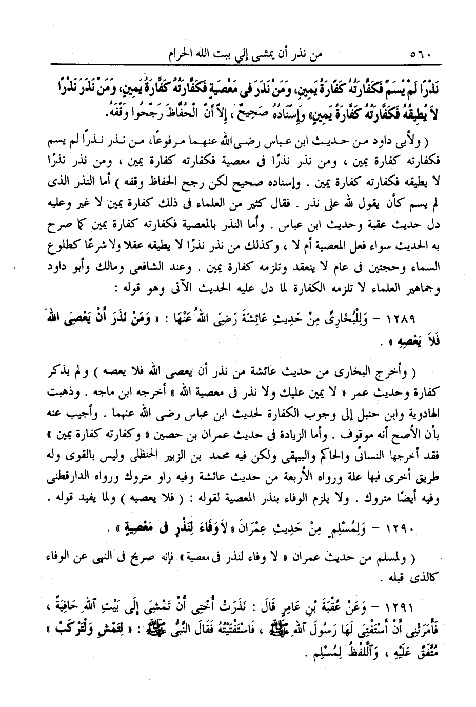 (1291) - وَعَنْ عُقْبَةَ بْنِ عَامِرٍ قَالَ: «نَذَرَتْ أُخْتِي أَنْ تَمْشِيَ إلَى بَيْتِ اللَّهِ حَافِيَةً، فَأَمَرَتْنِي أَنْ أَسْتَفْتِيَ لَهَا رَسُولَ اللَّهِ - صَلَّى اللَّهُ عَلَيْهِ وَسَلَّمَ -، فَاسْتَفْتَيْتُهُ فَقَالَ رَسُولُ اللَّهِ - صَلَّى اللَّهُ عَلَيْهِ وَسَلَّمَ -: لِتَمْشِ وَلْتَرْكَبْ» مُتَّفَقٌ عَلَيْهِ، وَاللَّفْظُ لِمُسْلِمٍ.