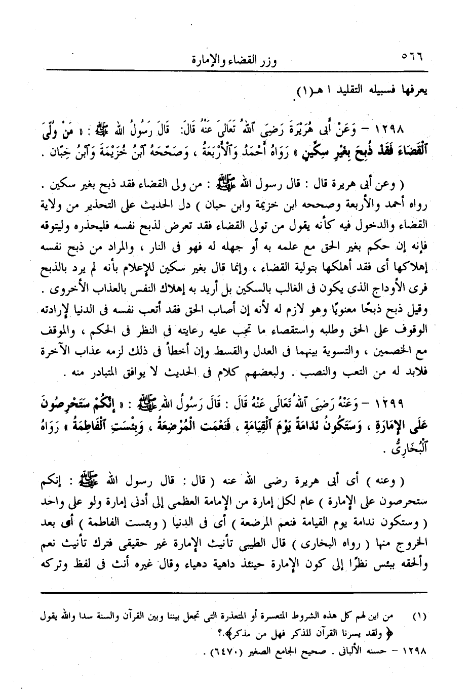 (1298) - وَعَنْ أَبِي هُرَيْرَةَ - رَضِيَ اللَّهُ تَعَالَى عَنْهُ - قَالَ: قَالَ رَسُولُ اللَّهِ - صَلَّى اللَّهُ عَلَيْهِ وَسَلَّمَ -: «مَنْ وَلِيَ الْقَضَاءَ فَقَدْ ذُبِحَ بِغَيْرِ سِكِّينٍ» رَوَاهُ أَحْمَدُ وَالْأَرْبَعَةُ، وَصَحَّحَهُ ابْنُ خُزَيْمَةَ وَابْنُ حِبَّانَ.