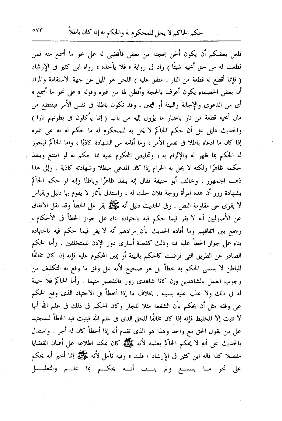 ـــــــــــــــــــــــــــــQفَلَعَلَّ بَعْضَكُمْ أَنْ يَكُونَ أَلْحَنَ بِحُجَّتِهِ مِنْ بَعْضٍ فَأَقْضِي لَهُ عَلَى نَحْوِ مَا أَسْمَعُ مِنْهُ فَمَنْ قَطَعْت لَهُ مِنْ حَقِّ أَخِيهِ شَيْئًا» زَادَ فِي رِوَايَةٍ " فَلَا يَأْخُذْهُ " رَوَاهُ ابْنُ كَثِيرٍ فِي الْإِرْشَادِ (" فَإِنَّمَا أَقْطَعُ لَهُ قِطْعَةً مِنْ النَّارِ ". مُتَّفَقٌ عَلَيْهِ) اللَّحْنُ هُوَ الْمَيْلُ عَنْ جِهَةِ الِاسْتِقَامَةِ وَالْمُرَادُ أَنَّ بَعْضَ الْخُصَمَاءِ يَكُونُ أَعْرَفَ بِالْحُجَّةِ وَأَفْطَنَ لَهَا مِنْ غَيْرِهِ وَقَوْلُهُ " عَلَى نَحْوِ مَا أَسْمَعُ " أَيْ مِنْ الدَّعْوَى وَالْإِجَابَةِ وَالْبَيِّنَةِ أَوْ الْيَمِينِ، وَقَدْ تَكُونُ بَاطِلَةً فِي نَفْسِ الْأَمْرِ فَيَقْتَطِعُ مِنْ مَالِ أَخِيهِ قِطْعَةً مِنْ نَارٍ بِاعْتِبَارِ مَا يَئُولُ إلَيْهِ مِنْ بَابِ {إِنَّمَا يَأْكُلُونَ فِي بُطُونِهِمْ نَارًا} [النساء: 10] وَالْحَدِيثُ دَلِيلٌ عَلَى أَنَّ حُكْمَ الْحَاكِمِ لَا يَحِلُّ بِهِ لِلْمَحْكُومِ لَهُ مَا حَكَمَ لَهُ بِهِ عَلَى غَيْرِهِ إذَا كَانَ مَا ادَّعَاهُ بَاطِلًا فِي نَفْسِ الْأَمْرِ، وَمَا أَقَامَهُ مِنْ الشَّهَادَةِ كَاذِبًا، وَأَمَّا الْحَاكِمُ فَيَجُوزُ لَهُ الْحُكْمُ بِمَا ظَهَرَ لَهُ وَالْإِلْزَامُ بِهِ، وَتَخْلِيصُ الْمَحْكُومِ عَلَيْهِ مِمَّا حَكَمَ بِهِ لَوْ امْتَنَعَ وَيَنْفُذُ حُكْمُهُ ظَاهِرًا وَلَكِنَّهُ لَا يَحِلُّ بِهِ الْحَرَامُ إذَا كَانَ الْمُدَّعِي مُبْطِلًا وَشَهَادَتُهُ كَاذِبَةٌ. وَإِلَى هَذَا ذَهَبَ الْجُمْهُورُ. وَخَالَفَ أَبُو حَنِيفَةَ فَقَالَ إنَّهُ يَنْفُذُ ظَاهِرًا وَبَاطِنًا وَإِنَّهُ لَوْ حَكَمَ الْحَاكِمُ بِشَهَادَةِ زُورٍ أَنَّ هَذِهِ الْمَرْأَةَ زَوْجَةُ فُلَانٍ حَلَّتْ لَهُ، وَاسْتَدَلَّ بِآثَارٍ لَا يَقُومُ بِهَا دَلِيلٌ وَبِقِيَاسٍ لَا يَقْوَى عَلَى مُقَاوَمَةِ النَّصِّ. وَفِي الْحَدِيثِ دَلِيلٌ عَلَى أَنَّهُ - صَلَّى اللَّهُ عَلَيْهِ وَسَلَّمَ - يُقِرُّ عَلَى الْخَطَإِ وَقَدْ نُقِلَ الِاتِّفَاقُ عَنْ الْأُصُولِيِّينَ أَنَّهُ لَا يُقِرُّ فِيمَا حَكَمَ فِيهِ بِاجْتِهَادِهِ بِنَاءً عَلَى جَوَازِ الْخَطَإِ فِي الْأَحْكَامِ، وَجَمَعَ بَيْنَ اتِّفَاقِهِمْ وَمَا أَفَادَهُ الْحَدِيثُ بِأَنَّ مُرَادَهُمْ أَنَّهُ لَا يُقِرُّ فِيمَا حَكَمَ فِيهِ بِاجْتِهَادِهِ بِنَاءً عَلَى جَوَازِ الْخَطَإِ عَلَيْهِ فِيهِ، وَذَلِكَ كَقِصَّةِ أُسَارَى دُورِ الْإِذْنِ لِلْمُتَخَلِّفِينَ. وَأَمَّا الْحُكْمُ الصَّادِرُ عَنْ الطَّرِيقِ الَّتِي فُرِضَتْ كَالْحُكْمِ بِالْبَيِّنَةِ أَوْ يَمِينِ الْمَحْكُومِ عَلَيْهِ فَإِنَّهُ إذَا كَانَ مُخَالِفًا لِلْبَاطِنِ لَا يُسَمَّى الْحُكْمُ بِهِ خَطَأً بَلْ هُوَ صَحِيحٌ؛ لِأَنَّهُ عَلَى وَفْقِ مَا وَقَعَ بِهِ التَّكْلِيفُ مِنْ وُجُوبِ الْعَمَلِ بِالشَّاهِدَيْنِ، وَإِنْ كَانَا شَاهِدَيْ زُورٍ فَالتَّقْصِيرُ مِنْهُمَا. وَأَمَّا الْحَاكِمُ فَلَا حِيلَةَ لَهُ فِي ذَلِكَ وَلَا عَتْبَ عَلَيْهِ بِسَبَبِهِ. بِخِلَافِ مَا إذَا أَخْطَأَ فِي الِاجْتِهَادِ الَّذِي وَقَعَ الْحُكْمُ عَلَى وَفْقِهِ مِثْلُ أَنْ يَحْكُمَ بِأَنَّ الشُّفْعَةَ مَثَلًا لِلْجَارِ، وَكَانَ الْحُكْمُ فِي ذَلِكَ فِي عِلْمِ اللَّهِ أَنَّهَا لَا تَثْبُتُ إلَّا لِلْخَلِيطِ فَإِنَّهُ إذَا كَانَ مُخَالِفًا لِلْحَقِّ الَّذِي فِي عِلْمِ اللَّهِ فَيَثْبُتُ فِيهِ الْخَطَأُ لِلْمُجْتَهِدِ عَلَى مَنْ يَقُولُ الْحَقَّ مَعَ وَاحِدٍ وَهَذَا هُوَ الَّذِي تَقَدَّمَ أَنَّهُ إذَا أَخْطَأَ كَانَ لَهُ أَجْرٌ. وَاسْتُدِلَّ بِالْحَدِيثِ عَلَى أَنَّهُ لَا يَحْكُمُ الْحَاكِمُ بِعِلْمِهِ؛ لِأَنَّهُ - صَلَّى اللَّهُ عَلَيْهِ وَسَلَّمَ - كَانَ يُمْكِنُ اطِّلَاعُهُ عَلَى أَعْيَانِ الْقَض