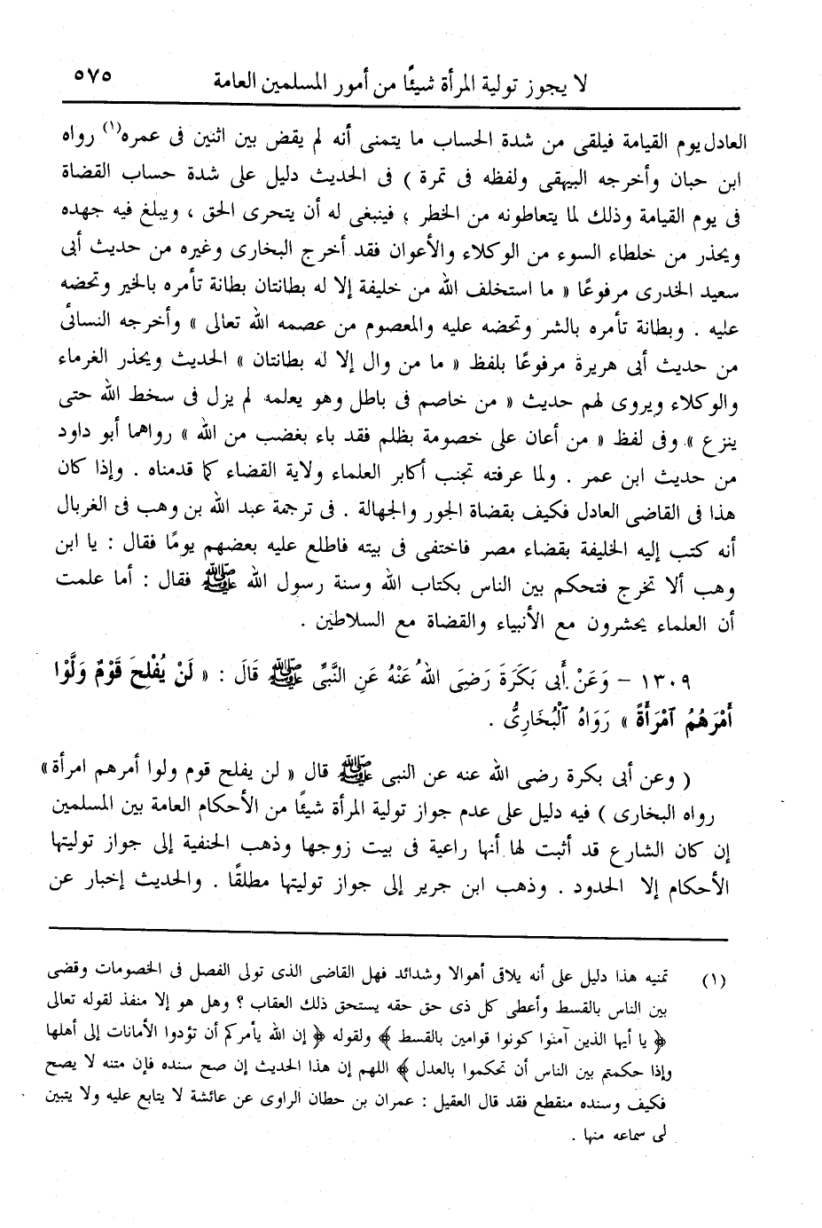 (1309) - وَعَنْ أَبِي بَكْرَةَ - رَضِيَ اللَّهُ عَنْهُ - عَنْ النَّبِيِّ - صَلَّى اللَّهُ عَلَيْهِ وَسَلَّمَ -: «لَنْ يُفْلِحْ قَوْمٌ وَلَّوْا أَمْرَهُمْ امْرَأَةً» رَوَاهُ الْبُخَارِيُّ.