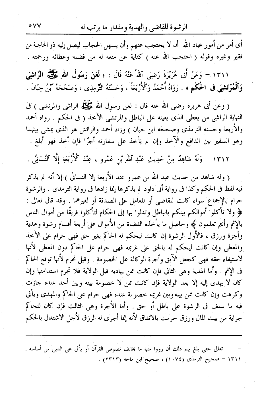 (1312) - وَلَهُ شَاهِدٌ مِنْ حَدِيثِ عَبْدِ اللَّهِ بْنِ عَمْرٍو، عِنْدَ الْأَرْبَعَةِ إلَّا النَّسَائِيّ. (وَلَهُ شَاهِدٌ مِنْ حَدِيثِ عَبْدِ اللَّهِ بْنِ عَمْرٍو عِنْدَ الْأَرْبَعَةِ إلَّا النَّسَائِيّ) إلَّا أَنَّهُ لَمْ يَذْكُرْ فِيهِ لَفْظَ " فِي الْحُكْمِ " وَكَذَا فِي رِوَايَةِ أَبِي دَاوُد لَمْ يَذْكُرْهَا إنَّمَا زَادَهَا فِي رِوَايَةِ التِّرْمِذِيِّ. وَالرِّشْوَةُ حَرَامٌ بِالْإِجْمَاعِ سَوَاءٌ كَانَتْ لِلْقَاضِي أَوْ لِلْعَامِلِ عَلَى الصَّدَقَةِ أَوْ لِغَيْرِهَا. وَقَدْ قَالَ تَعَالَى: {وَلا تَأْكُلُوا أَمْوَالَكُمْ بَيْنَكُمْ بِالْبَاطِلِ وَتُدْلُوا بِهَا إِلَى الْحُكَّامِ لِتَأْكُلُوا فَرِيقًا مِنْ أَمْوَالِ النَّاسِ بِالإِثْمِ وَأَنْتُمْ تَعْلَمُونَ} [البقرة: 188] وَحَاصِلُ مَا يَأْخُذُهُ الْقُضَاةُ مِنْ الْأَمْوَالِ عَلَى أَرْبَعَةِ أَقْسَامٍ رِشْوَةٌ وَهَدِيَّةٌ وَأُجْرَةٌ وَرِزْقٌ؛ فَالْأَوَّلُ الرِّشْوَةُ إنْ كَانَتْ لِيَحْكُمَ لَهُ الْحَاكِمُ بِغَيْرِ حَقٍّ فَهِيَ حَرَامٌ عَلَى الْآخِذِ وَالْمُعْطِي وَإِنْ كَانَتْ لِيَحْكُم لَهُ بِالْحَقِّ عَلَى غَرِيمِهِ فَهِيَ حَرَامٌ عَلَى الْحَاكِمِ دُون الْمُعْطَى؛ لِأَنَّهَا لِاسْتِيفَاءِ حَقِّهِ فَهِيَ كَجُعْلِ الْآبِقِ وَأُجْرَةِ الْوَكَالَةِ عَلَى الْخُصُومَةِ. وَقِيلَ تَحْرُمُ؛ لِأَنَّهَا تُوقِعُ الْحَاكِمَ فِي الْإِثْمِ. وَأَمَّا الْهَدِيَّةُ وَهِيَ الثَّانِي فَإِنْ كَانَتْ مِمَّنْ يُهَادِيهِ قَبْلَ الْوِلَايَةِ فَلَا تَحْرُمْ اسْتِدَامَتُهَا وَإِنْ كَانَ لَا يُهْدَى إلَيْهِ إلَّا بَعْدَ الْوِلَايَةِ فَإِنْ كَانَتْ مِمَّنْ لَا خُصُومَةَ بَيْنَهُ وَبَيْنَ أَحَدٍ عِنْدَهُ جَازَتْ وَكُرِهَتْ، وَإِنْ كَانَتْ مِمَّنْ بَيْنَهُ وَبَيْنَ غَرِيمِهِ خُصُومَةٌ عِنْدَهُ فَهِيَ حَرَامٌ عَلَى الْحَاكِمِ وَالْمُهْدَى وَيَأْتِي فِيهِ مَا سَلَفَ فِي الرِّشْوَةِ عَلَى بَاطِلٍ أَوْ حَقٍّ. وَأَمَّا الْأُجْرَةُ وَهِيَ الثَّالِثُ فَإِنْ كَانَ لِلْحَاكِمِ جِرَايَةٌ مِنْ بَيْتِ الْمَالِ وَرِزْقٌ حَرُمَتْ بِالِاتِّفَاقِ؛ لِأَنَّهُ إنَّمَا أَجْرَى لَهُ الرِّزْقَ لِأَجْلِ الِاشْتِغَالِ بِالْحُكْمِ