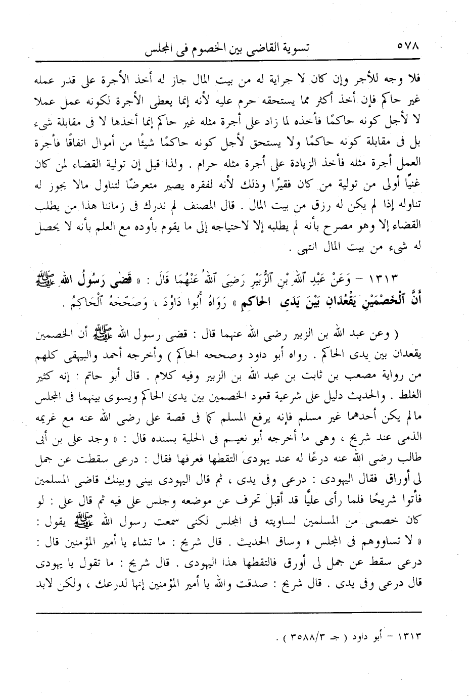 (1313) - وَعَنْ عَبْدِ اللَّهِ بْنِ الزُّبَيْرِ - رَضِيَ اللَّهُ عَنْهُمَا - قَالَ: «قَضَى رَسُولُ اللَّهِ - صَلَّى اللَّهُ عَلَيْهِ وَسَلَّمَ - أَنَّ الْخَصْمَيْنِ يَقْعُدَانِ بَيْنَ يَدَيْ الْحَاكِمِ» رَوَاهُ أَبُو دَاوُد، وَصَحَّحَهُ الْحَاكِمُ.