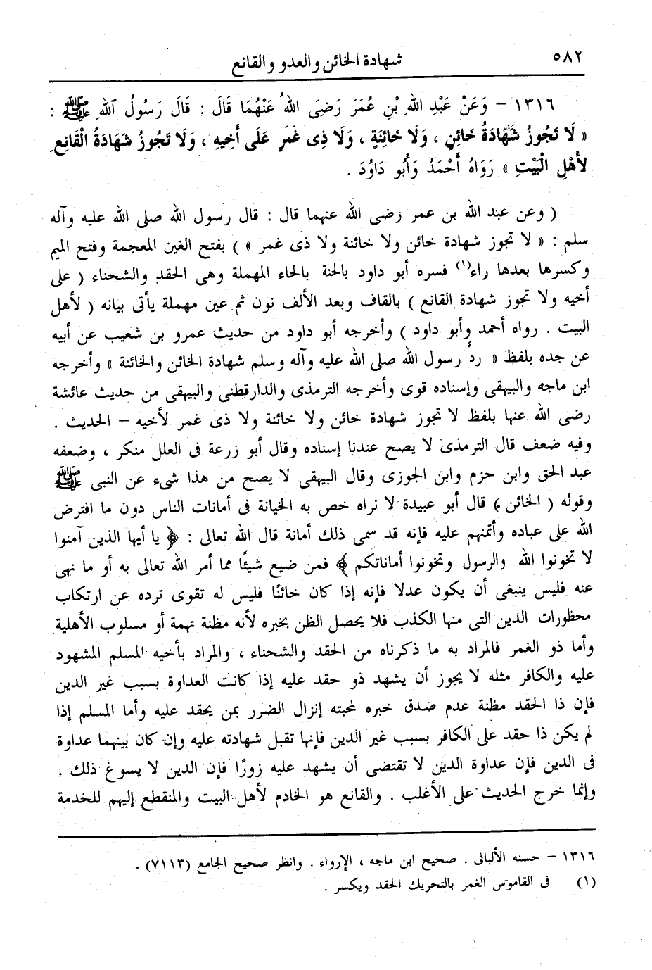 وَعَنْ عَبْدِ اللَّهِ بْنِ عُمَرَ - رَضِيَ اللَّهُ عَنْهُمَا - قَالَ: قَالَ رَسُولُ اللَّهِ - صَلَّى اللَّهُ عَلَيْهِ وَسَلَّمَ -: «لَا تَجُوزُ شَهَادَةُ، خَائِنٍ وَلَا خَائِنَةٍ، وَلَا ذِي غَمَرٍ عَلَى أَخِيهِ، وَلَا تَجُوزُ شَهَادَةُ الْقَانِعِ لِأَهْلِ الْبَيْتِ» رَوَاهُ أَحْمَدُ وَأَبُو دَاوُد.