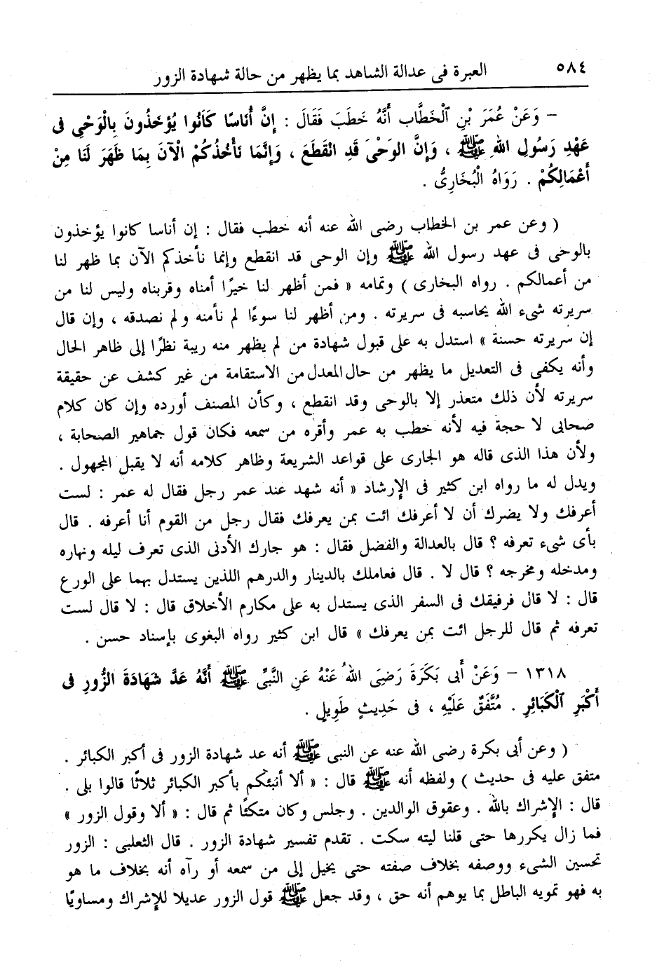 (1318) - وَعَنْ أَبِي بَكْرَةَ - رَضِيَ اللَّهُ عَنْهُ - «عَنْ النَّبِيِّ - صَلَّى اللَّهُ عَلَيْهِ وَسَلَّمَ - أَنَّهُ عَدَّ شَهَادَةَ الزُّورِ فِي أَكْبَرِ الْكَبَائِرِ» . مُتَّفَقٌ عَلَيْهِ، فِي حَدِيثٍ طَوِيلٍ.
