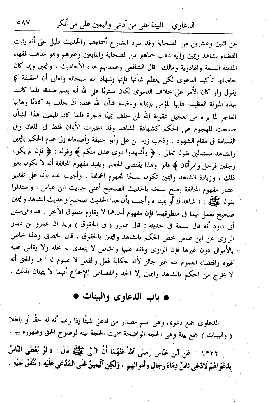 (1322) - عَنْ ابْنِ عَبَّاسٍ - رَضِيَ اللَّهُ عَنْهُمَا - أَنَّ النَّبِيَّ - صَلَّى اللَّهُ عَلَيْهِ وَسَلَّمَ - قَالَ: «لَوْ يُعْطَى النَّاسُ بِدَعْوَاهُمْ لَادَّعَى نَاسٌ دِمَاءَ رِجَالِ وَأَمْوَالِهِمْ، وَلَكِنَّ الْيَمِينَ عَلَى الْمُدَّعَى عَلَيْهِ» مُتَّفَقٌ عَلَيْهِ.