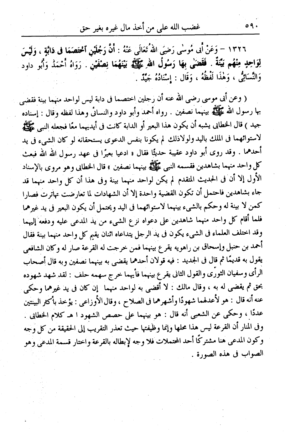 ـــــــــــــــــــــــــــــQ (وَعَنْ أَبِي مُوسَى - رَضِيَ اللَّهُ عَنْهُ - «أَنَّ رَجُلَيْنِ اخْتَصَمَا فِي دَابَّةٍ لَيْسَ لِوَاحِدٍ مِنْهُمَا بَيِّنَةٌ فَقَضَى بِهَا رَسُولُ اللَّهِ - صَلَّى اللَّهُ عَلَيْهِ وَسَلَّمَ - بَيْنَهُمَا نِصْفَيْنِ» . رَوَاهُ أَحْمَدُ وَأَبُو دَاوُد وَالنَّسَائِيُّ وَهَذَا لَفْظُهُ وَقَالَ: إسْنَادُهُ جَيِّدٌ) قَالَ الْخَطَّابِيُّ يُشْبِهُ أَنْ يَكُونَ هَذَا الْبَعِيرُ أَوْ الدَّابَّةُ الَّتِي كَانَتْ فِي أَيْدِيهِمَا مَعًا فَجَعَلَهُ النَّبِيُّ - صَلَّى اللَّهُ عَلَيْهِ وَسَلَّمَ - لِاسْتِوَائِهِمَا فِي الْمِلْكِ بِالْيَدِ وَلَوْلَا ذَلِكَ لَمْ يَكُونَا بِنَفْسِ الدَّعْوَى يَسْتَحِقَّانِهِ لَوْ كَانَ الشَّيْءُ فِي يَدِ أَحَدِهِمَا. وَقَدْ رَوَى أَبُو دَاوُد عَقِيبَهُ حَدِيثًا فَقَالَ: «ادَّعَيَا بَعِيرًا فِي عَهْدِ رَسُولِ اللَّهِ فَبَعَثَ كُلُّ وَاحِدٍ مِنْهُمَا بِشَاهِدَيْنِ، فَقَسَمَهُ النَّبِيُّ - صَلَّى اللَّهُ عَلَيْهِ وَسَلَّمَ - بَيْنَهُمَا نِصْفَيْنِ» قَالَ الْخَطَّابِيُّ وَهُوَ مَرْوِيٌّ بِالْإِسْنَادِ الْأَوَّلِ إلَّا أَنَّ فِي الْحَدِيثِ الْمُتَقَدِّمِ لَمْ يَكُنْ لِوَاحِدِ مِنْهُمَا بَيِّنَةٌ، وَفِي هَذَا أَنَّ كُلَّ وَاحِدٍ مِنْهُمَا قَدْ جَاءَ بِشَاهِدَيْنِ فَاحْتُمِلَ أَنْ تَكُونَ الْقَضِيَّةُ وَاحِدَةً إلَّا أَنَّ الشَّهَادَاتِ لَمَّا تَعَارَضَتْ تَهَاتَرَتْ فَصَارَا كَمَنْ لَا بَيِّنَةَ لَهُ وَحَكَمَ بِالشَّيْءِ بَيْنَهُمَا لِاسْتِوَائِهِمَا فِي الْيَدِ وَيُحْتَمَلُ أَنْ يَكُونَ الْبَعِيرُ فِي يَدِ غَيْرِهِمَا فَلَمَّا أَقَامَ كُلُّ وَاحِدٍ مِنْهُمَا شَاهِدَيْنِ عَلَى دَعْوَاهُ نُزِعَ الشَّيْءُ مِنْ يَدِ الْمُدَّعَى عَلَيْهِ وَدَفَعَهُ إلَيْهِمَا وَقَدْ اخْتَلَفَ الْعُلَمَاءُ فِي الشَّيْءِ يَكُونُ فِي يَدِ الرَّجُلِ يَتَدَاعَاهُ اثْنَانِ يُقِيمُ كُلُّ وَاحِدٍ مِنْهُمَا بَيِّنَةً فَقَالَ أَحْمَدُ بْنُ حَنْبَلٍ وَإِسْحَاقُ بْنُ رَاهْوَيْهِ يُقْرَعُ بَيْنَهُمَا فَمَنْ خَرَجَتْ لَهُ الْقُرْعَةُ صَارَ لَهُ، وَكَانَ الشَّافِعِيُّ يَقُولُ بِهِ قَدِيمًا ثُمَّ قَالَ فِي الْجَدِيدِ: فِيهِ قَوْلَانِ أَحَدُهُمَا: يُقْضَى بِهِ بَيْنَهُمَا نِصْفَيْنِ وَبِهِ قَالَ أَصْحَابُ الرَّأْيِ وَسُفْيَانُ الثَّوْرِيُّ وَالْقَوْلُ الثَّانِي يُقْرَعُ بَيْنَهُمَا فَأَيُّهُمَا خَرَجَ سَهْمُهُ حَلَفَ: لَقَدْ شَهِدَ شُهُودُهُ بِحَقٍّ ثُمَّ يُقْضَى لَهُ بِهِ، وَقَالَ مَالِكٌ: لَا أَقْضِي بِهِ لِوَاحِدٍ مِنْهُمَا إنْ كَانَ فِي يَدِ غَيْرِهِمَا وَحُكِيَ عَنْهُ أَنَّهُ قَالَ: هُوَ لِأَعْدِلهُمَا شُهُودًا وَأَشْهَرِهِمَا فِي الصَّلَاحِ، وَقَالَ الْأَوْزَاعِيُّ: يُؤْخَذُ بِأَكْثَرِ الْبَيِّنَتَيْنِ عَدَدًا، وَحُكِيَ عَنْ الشَّعْبِيِّ أَنَّهُ قَالَ: هُوَ بَيْنَهُمَا عَلَى حِصَصِ الشُّهُودِ ا. هـ. كَلَامُ الْخَطَّابِيِّ. وَفِي الْمَنَارِ أَنَّ الْقُرْعَةَ لَيْسَ هَذَا مَحَلُّهَا وَإِنَّمَا وَظِيفَتُهَا حَيْثُ تَعَذَّرَ التَّقْرِيبُ إلَى الْحَقِيقَةِ مِنْ كُلِّ وَجْهٍ وَكَوْنُ الْمُدَّعَى هُنَا مُشْتَرَكًا أَحَدُ الْمُحْتَمَلَاتِ فَلَا وَجْهَ لِإِبْطَالِهِ بِالْقُرْعَةِ وَاخْتَارَ قِسْمَةَ الْمُدَّعَى وَهُوَ الصَّوَابُ فِي هَذِهِ الصُّورَةِ.