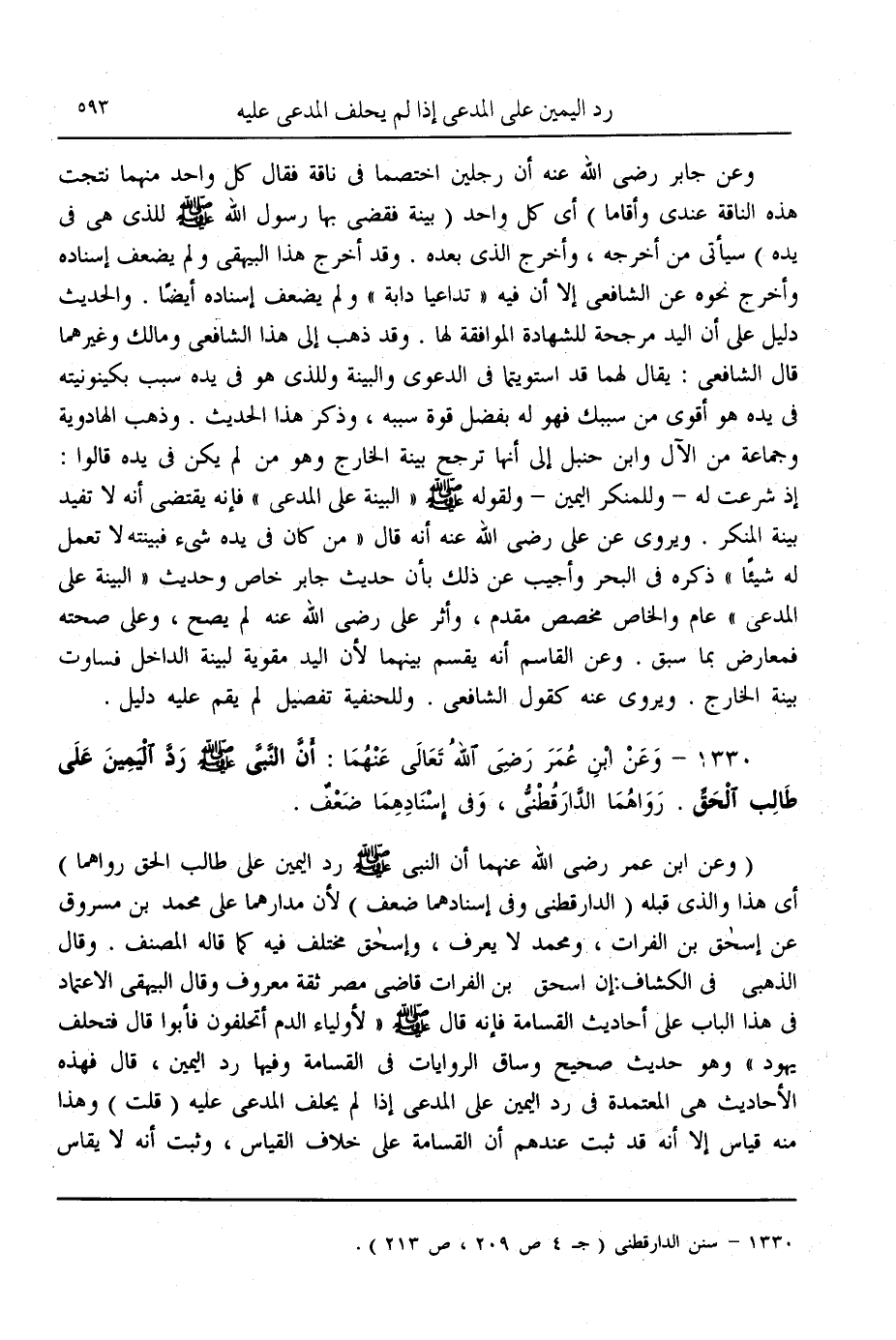 (1330) - وَعَنْ ابْنِ عُمَرَ - رَضِيَ اللَّهُ تَعَالَى عَنْهُمَا -: «أَنَّ النَّبِيَّ - صَلَّى اللَّهُ عَلَيْهِ وَسَلَّمَ - رَدَّ الْيَمِينَ عَلَى طَالِبِ الْحَقِّ» . رَوَاهُمَا الدَّارَقُطْنِيُّ، وَفِي إسْنَادِهِمَا ضَعْفٌ.