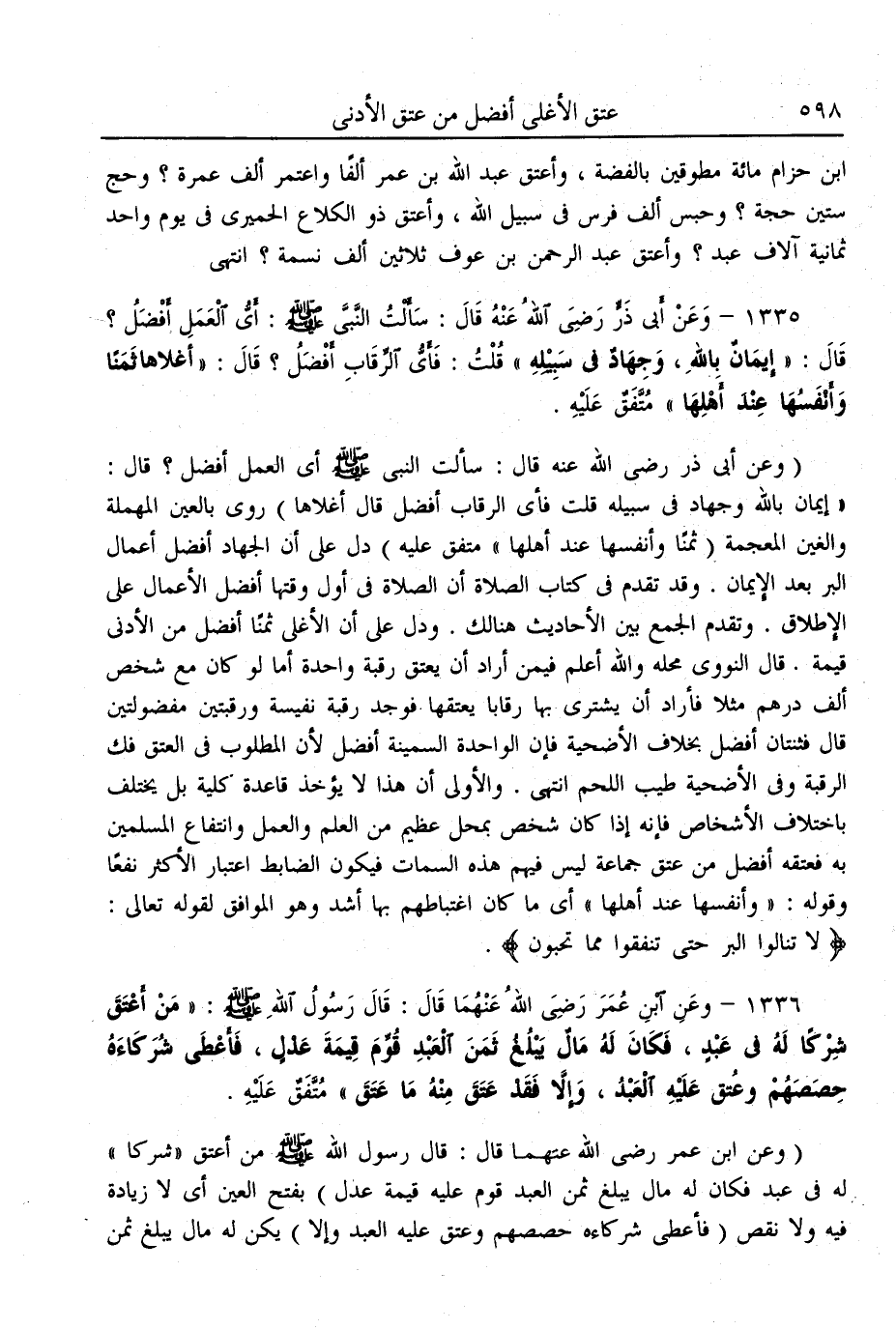 (1335) - وَعَنْ «أَبِي ذَرٍّ - رَضِيَ اللَّهُ عَنْهُ - قَالَ: سَأَلْت النَّبِيَّ - صَلَّى اللَّهُ عَلَيْهِ وَسَلَّمَ -: أَيُّ الْعَمَلِ أَفْضَلُ؟ قَالَ: إيمَانٌ بِاَللَّهِ، وَجِهَادٌ فِي سَبِيلِهِ قُلْت: فَأَيُّ الرِّقَابِ أَفْضَلُ؟ قَالَ: أَغْلَاهَا ثَمَنًا وَأَنْفَسُهَا عِنْدَ أَهْلِهَا» مُتَّفَقٌ عَلَيْهِ
