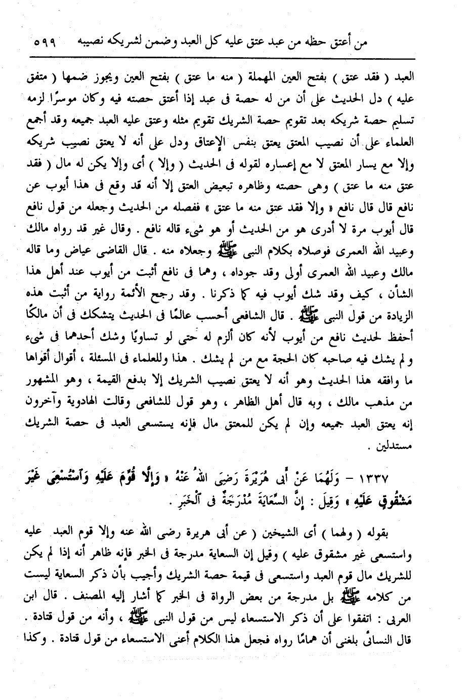 (1337) - وَلَهُمَا عَنْ أَبِي هُرَيْرَةَ - رَضِيَ اللَّهُ عَنْهُ - " وَإِلَّا قُوِّمَ عَلَيْهِ وَاسْتُسْعِيَ غَيْرَ مَشْقُوقٍ عَلَيْهِ " وَقِيلَ: إنَّ السِّعَايَةَ مُدْرَجَةٌ فِي الْخَبَر ِ. بِقَوْلِهِ (وَلَهُمَا) أَيْ الشَّيْخَيْنِ (عَنْ أَبِي هُرَيْرَةَ - رَضِيَ اللَّهُ عَنْهُ - " وَإِلَّا قُوِّمَ الْعَبْدُ عَلَيْهِ وَاسْتُسْعِيَ غَيْرَ مَشْقُوقٍ عَلَيْهِ ") وَقِيلَ إنَّ السِّعَايَةَ مُدْرَجَةٌ فِي الْخَبَرِ فَإِنَّهُ ظَاهِرٌ أَنَّهُ إذَا لَمْ يَكُنْ لَلشَّرِيك مَالٌ قُوِّمَ الْعَبْدُ وَاسْتُسْعِيَ فِي قِيمَةِ حِصَّةِ الشَّرِيكِ وَأُجِيبُ بِأَنَّ ذِكْرَ السِّعَايَةِ لَيْسَتْ مِنْ كَلَامِهِ - صَلَّى اللَّهُ عَلَيْهِ وَسَلَّمَ - بَلْ مُدْرَجَةٌ مِنْ بَعْضِ الرُّوَاةِ فِي الْخَبَرِ كَمَا أَشَارَ إلَيْهِ الْمُصَنِّفُ.