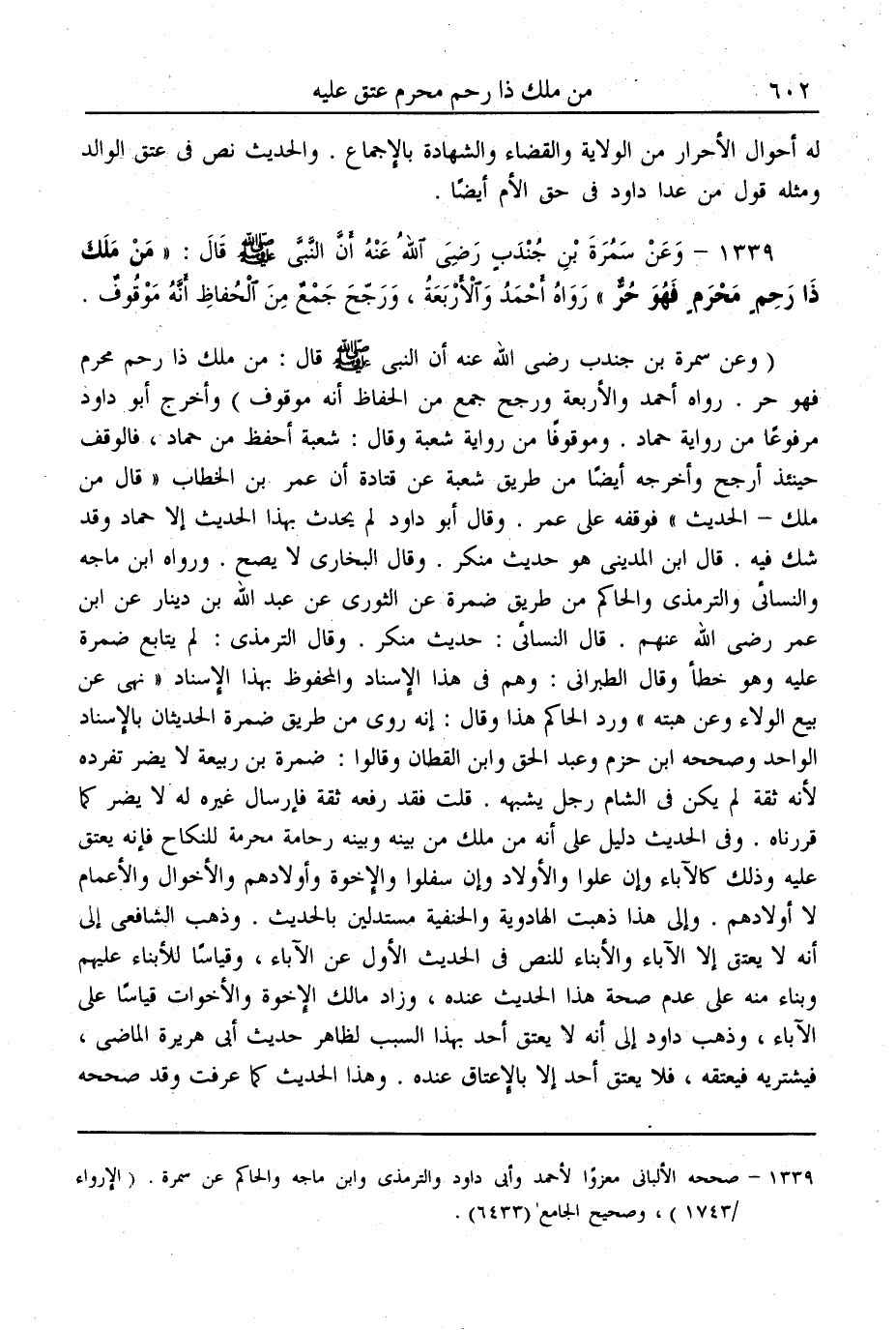 (1339) - وَعَنْ سَمُرَةَ بْنِ جُنْدُبٍ - رَضِيَ اللَّهُ عَنْهُ - أَنَّ النَّبِيَّ - صَلَّى اللَّهُ عَلَيْهِ وَسَلَّمَ - قَالَ: «مَنْ مَلَكَ ذَا رَحِمٍ مَحْرَمٍ فَهُوَ حُرٌّ» رَوَاهُ أَحْمَدُ وَالْأَرْبَعَةُ، وَرَجَّحَ جَمْعٌ مِنْ الْحُفَّاظِ أَنَّهُ مَوْقُوفٌ.