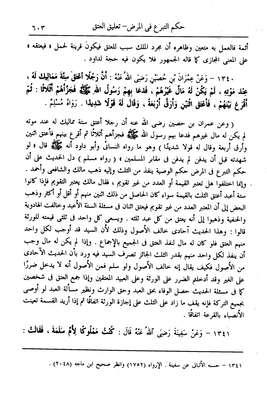 (1340) - وَعَنْ عِمْرَانَ بْنِ حُصَيْنٍ - رَضِيَ اللَّهُ عَنْهُ -: «أَنَّ رَجُلًا أَعْتَقَ سِتَّةَ مَمَالِيكَ لَهُ، عِنْدَ مَوْتِهِ، لَمْ يَكُنْ لَهُ مَالٌ غَيْرُهُمْ، فَدَعَا بِهِمْ رَسُولُ اللَّهِ - صَلَّى اللَّهُ عَلَيْهِ وَسَلَّمَ - فَجَزَّأَهُمْ أَثْلَاثًا: ثُمَّ أَقْرَعَ بَيْنَهُمْ، فَأَعْتَقَ اثْنَيْنِ وَأَرَقَّ أَرْبَعَةً، وَقَالَ لَهُ قَوْلًا شَدِيدًا» . رَوَاهُ مُسْلِمٌ.