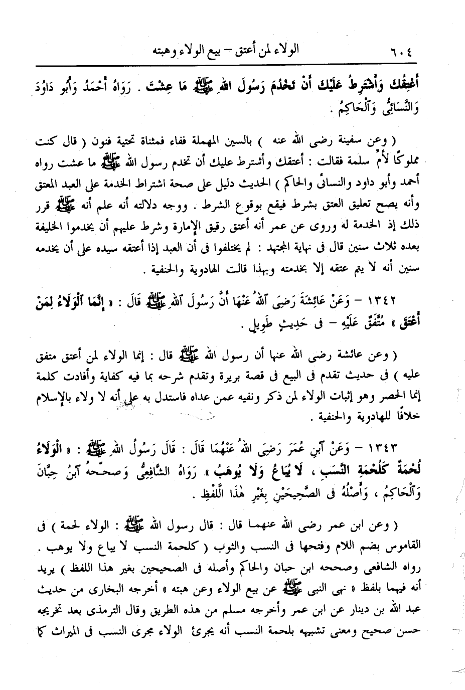 (1343) - وَعَنْ ابْنِ عُمَرَ - رَضِيَ اللَّهُ عَنْهُمَا - قَالَ: قَالَ رَسُولُ اللَّهِ - صَلَّى اللَّهُ عَلَيْهِ وَسَلَّمَ -: «الْوَلَاءُ لُحْمَةٌ كَلُحْمَةِ النَّسَبِ، لَا يُبَاعُ وَلَا يُوهَبُ» رَوَاهُ الشَّافِعِيُّ وَصَحَّحَهُ ابْنُ حِبَّانَ وَالْحَاكِمُ، وَأَصْلُهُ فِي الصَّحِيحَيْنِ بِغَيْرِ هَذَا اللَّفْظِ.