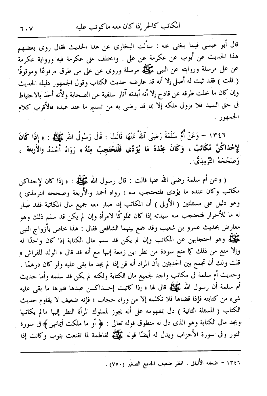 (1346) - وَعَنْ أُمِّ سَلَمَةَ - رَضِيَ اللَّهُ عَنْهَا - قَالَتْ: قَالَ رَسُولُ اللَّهِ - صَلَّى اللَّهُ عَلَيْهِ وَسَلَّمَ -: «إذَا كَانَ لِإِحْدَاكُنَّ مُكَاتَبٌ، وَكَانَ عِنْدَهُ مَا يُؤَدَّى فَلْتَحْتَجِبْ مِنْهُ» رَوَاهُ أَحْمَدُ وَالْأَرْبَعَةُ، وَصَحَّحَهُ التِّرْمِذِيُّ.