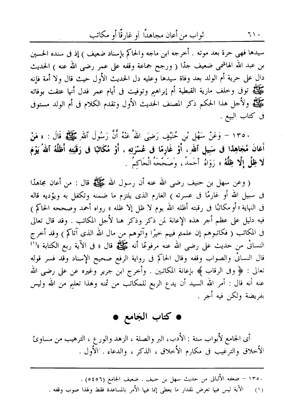 (1350) - وَعَنْ سَهْلِ بْنِ حُنَيْفٍ - رَضِيَ اللَّهُ عَنْهُ - أَنَّ رَسُولَ اللَّهِ - صَلَّى اللَّهُ عَلَيْهِ وَسَلَّمَ - قَالَ: «مَنْ أَعَانَ مُجَاهِدًا فِي سَبِيلِ اللَّهِ، أَوْ غَارِمًا فِي عُسْرَتِهِ، أَوْ مُكَاتَبًا فِي رَقَبَتِهِ أَظَلَّهُ اللَّهُ يَوْمَ لَا ظِلَّ إلَّا ظِلُّهُ» رَوَاهُ أَحْمَدُ، وَصَحَّحَهُ الْحَاكِمُ.