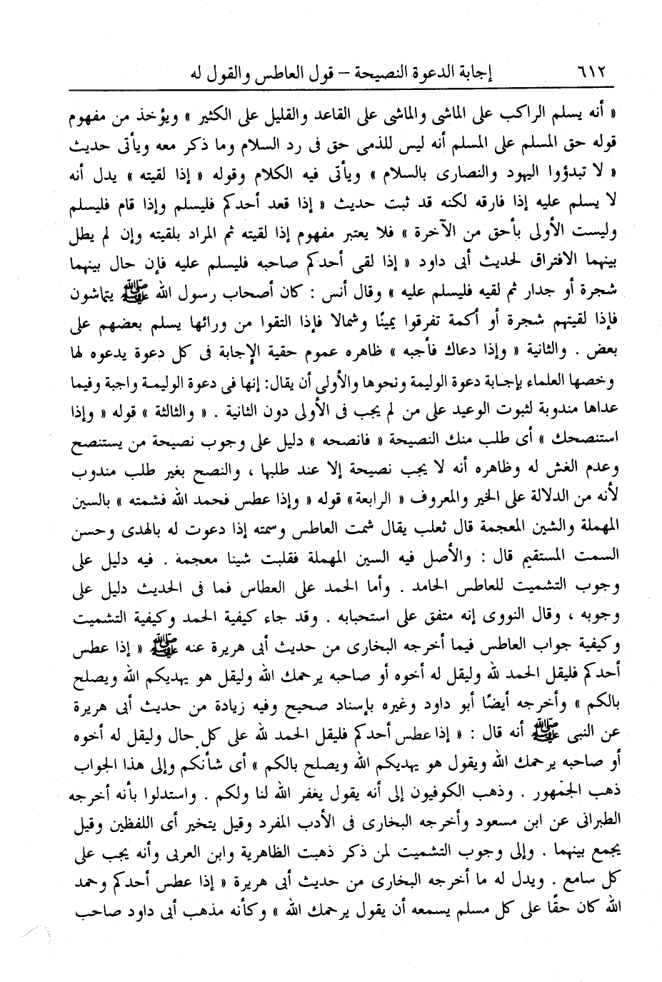 وَيَدُلُّ لَهُ مَا أَخْرَجَهُ الْبُخَارِيُّ مِنْ حَدِيثِ أَبِي هُرَيْرَةَ «إذَا عَطَسَ أَحَدُكُمْ وَحَمِدَ اللَّهَ كَانَ حَقًّا عَلَى كُلِّ مُسْلِمٍ يَسْمَعُهُ أَنْ يَقُولَ يَرْحَمُك اللَّهُ» وَكَأَنَّهُ مَذْهَب أَبِي دَاوُد صَاحِبِ السُّنَنِ