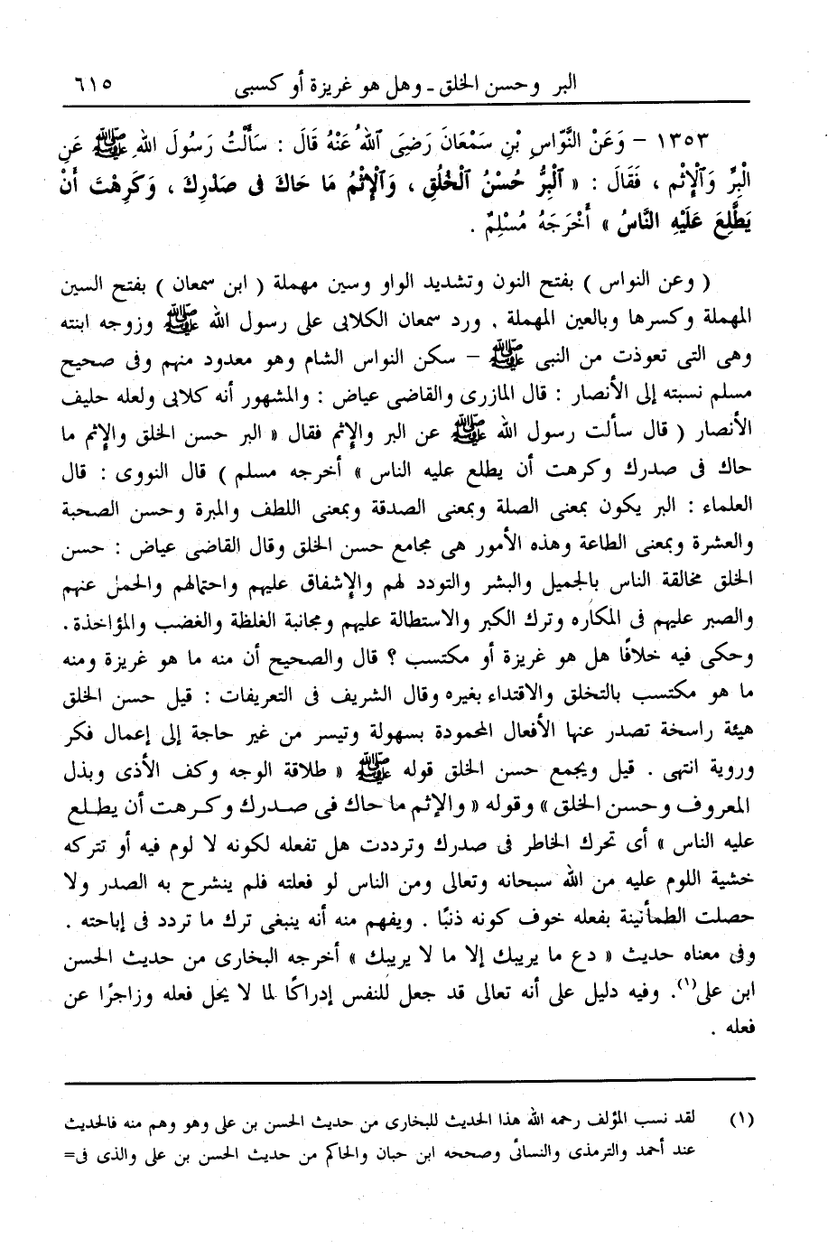 وَعَنْ النَّوَّاسِ بْنِ سَمْعَانَ - رَضِيَ اللَّهُ عَنْهُ - قَالَ: «سَأَلْت رَسُولَ اللَّهِ - صَلَّى اللَّهُ عَلَيْهِ وَسَلَّمَ - عَنْ الْبِرِّ وَالْإِثْمِ، فَقَالَ: الْبِرُّ حُسْنُ الْخُلُقِ، وَالْإِثْمُ مَا حَاكَ فِي صَدْرِك، وَكَرِهْت أَنْ يَطَّلِعَ عَلَيْهِ النَّاسُ» أَخْرَجَهُ مُسْلِمٌ.