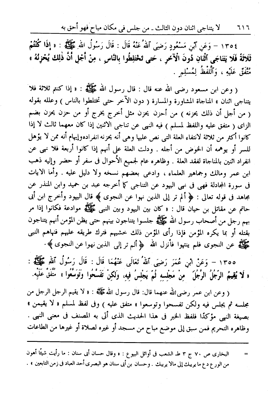 (وَعَنْ ابْنِ مَسْعُودٍ - رَضِيَ اللَّهُ عَنْهُ - قَالَ: قَالَ رَسُولُ اللَّهِ - صَلَّى اللَّهُ عَلَيْهِ وَسَلَّمَ -: «إذَا كُنْتُمْ ثَلَاثَةً فَلَا يَتَنَاجَى اثْنَانِ» الْمُنَاجَاةُ الْمُشَاوِرَةُ وَالْمُسَارَّةُ (دُونَ الْآخَرِ حَتَّى تَخْتَلِطُوا بِالنَّاسِ) وَعَلَّلَهُ بِقَوْلِهِ (مِنْ أَجْلِ أَنَّ ذَلِكَ يُحْزِنُهُ) مِنْ أَحْزَنَ يُحْزِنُ مِثْلُ أَخْرَجَ يُخْرِجُ أَوْ مِنْ حَزَنَ يَحْزُنُ بِضَمِّ الزَّايِ (مُتَّفَقٌ عَلَيْهِ وَاللَّفْظُ لِمُسْلِمٍ) فِيهِ النَّهْيُ عَنْ تَنَاجِي الِاثْنَيْنِ إذَا كَانَ مَعَهُمَا ثَالِثٌ إلَّا إذَا كَانُوا أَكْثَرَ مِنْ ثَلَاثَةٍ لِانْتِفَاءِ الْعِلَّةِ الَّتِي نَصَّ عَلَيْهَا وَهِيَ أَنَّهُ يُحْزِنُهُ انْفِرَادُهُ وَإِيهَامُ أَنَّهُ مِمَّنْ لَا يُؤْهَلْ لِلسِّرِّ أَوْ يُوهِمُهُ أَنَّ الْخَوْضَ مِنْ أَجْلِهِ وَدَلَّتْ الْعِلَّةُ عَلَى أَنَّهُمْ إذَا كَانُوا أَرْبَعَةً فَلَا نَهْيَ عَنْ انْفِرَادِ اثْنَيْنِ بِالْمُنَاجَاةِ لِفَقْدِ الْعِلَّةِ. وَظَاهِرُهُ عَامٌّ لِجَمِيعِ الْأَحْوَالِ فِي سَفَرٍ أَوْ حَضَرٍ وَإِلَيْهِ ذَهَبَ ابْنُ عُمَرَ وَمَالِكٌ وَجَمَاهِيرُ الْعُلَمَاءِ، وَادَّعَى بَعْضُهُمْ نَسْخَهُ وَلَا دَلِيلَ عَلَيْهِ. وَأَمَّا الْآيَاتُ فِي سُورَةِ الْمُجَادَلَةِ فَهِيَ فِي نَهْيِ الْيَهُودِ عَنْ التَّنَاجِي كَمَا أَخْرَجَهُ عَبْدُ بْنُ حُمَيْدٍ وَابْنُ الْمُنْذِرِ عَنْ مُجَاهِدٍ فِي قَوْله تَعَالَى: {أَلَمْ تَرَ إِلَى الَّذِينَ نُهُوا عَنِ النَّجْوَى} [المجادلة: 8] قَالَ الْيَهُودُ وَأَخْرَجَ ابْنُ أَبِي حَاتِمٍ عَنْ مُقَاتِلِ بْنِ حَيَّانَ قَالَ: «كَانَ بَيْنَ الْيَهُودِ وَبَيْنَ النَّبِيِّ - صَلَّى اللَّهُ عَلَيْهِ وَسَلَّمَ - مُوَادَعَةٌ فَكَانُوا إذَا مَرَّ بِهِمْ رَجُلٌ مِنْ أَصْحَابِ رَسُولِ اللَّهِ - صَلَّى اللَّهُ عَلَيْهِ وَسَلَّمَ - جَلَسُوا يَتَنَاجَوْنَ بَيْنَهُمْ حَتَّى يَظُنَّ الْمُؤْمِنُ أَنَّهُمْ يَتَنَاجَوْنَ بِقَتْلِهِ أَوْ بِمَا يَكْرَهُ الْمُؤْمِنُ فَإِذَا رَأَى الْمُؤْمِنُ ذَلِكَ خَشِيَهُمْ فَتَرَكَ طَرِيقَهُ عَلَيْهِمْ فَنَهَاهُمْ النَّبِيُّ - صَلَّى اللَّهُ عَلَيْهِ وَسَلَّمَ - عَنْ النَّجْوَى فَلَمْ يَنْتَهُوا فَأَنْزَلَ اللَّهُ {أَلَمْ تَرَ إِلَى الَّذِينَ نُهُوا عَنِ النَّجْوَى} [المجادلة: 8] » . .