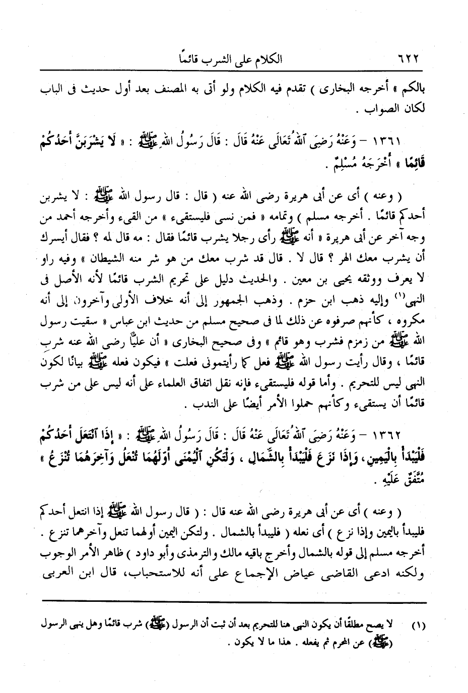 (1361) - وَعَنْهُ - رَضِيَ اللَّهُ تَعَالَى عَنْهُ - قَالَ: قَالَ رَسُولُ اللَّهِ - صَلَّى اللَّهُ عَلَيْهِ وَسَلَّمَ -: «لَا يَشْرَبَنَّ أَحَدُكُمْ قَائِمًا» أَخْرَجَهُ مُسْلِمٌ.