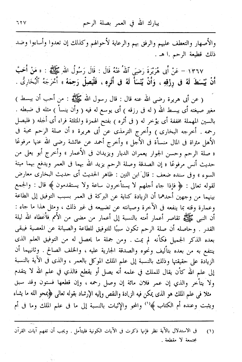 (1367) - عَنْ أَبِي هُرَيْرَةَ - رَضِيَ اللَّهُ عَنْهُ - قَالَ: قَالَ رَسُولُ اللَّهِ - صَلَّى اللَّهُ عَلَيْهِ وَسَلَّمَ -: «مَنْ أَحَبَّ أَنْ يُبْسَطَ لَهُ فِي رِزْقِهِ، وَأَنْ يُنْسَأَ لَهُ فِي أَثَرِهِ، فَلْيَصِلْ رَحِمَهُ» أَخْرَجَهُ الْبُخَارِيُّ.