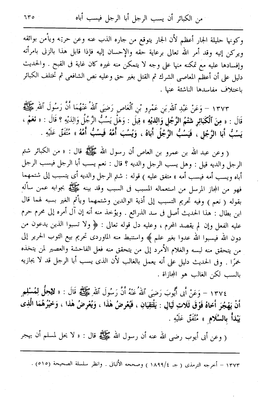 (1373) - وَعَنْ عَبْدِ اللَّهِ بْنِ عَمْرِو بْنِ الْعَاصِ - رَضِيَ اللَّهُ عَنْهُمَا - أَنَّ رَسُولَ اللَّهِ - صَلَّى اللَّهُ عَلَيْهِ وَسَلَّمَ - قَالَ: «مِنْ الْكَبَائِرِ شَتْمُ الرَّجُلِ وَالِدَيْهِ قِيلَ: وَهَلْ يَسُبُّ الرَّجُلُ وَالِدَيْهِ؟ قَالَ: نَعَمْ، يَسُبُّ أَبَا الرَّجُلِ، فَيَسُبُّ الرَّجُلُ أَبَاهُ، وَيَسُبُّ أُمَّهُ فَيَسُبُّ أُمَّهُ» مُتَّفَقٌ عَلَيْهِ.