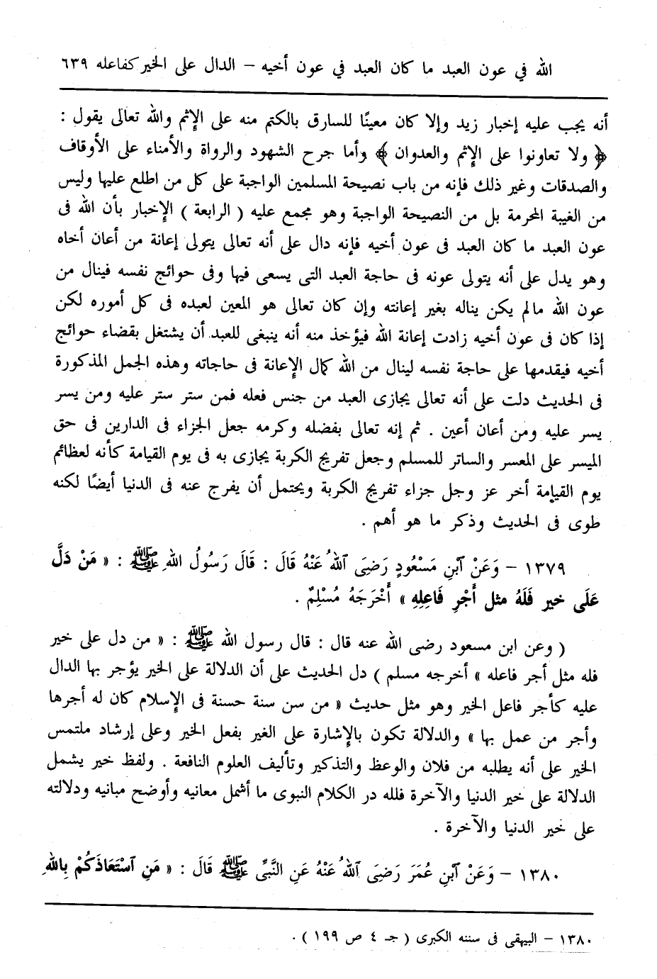 (1379) - وَعَنْ ابْنِ مَسْعُودٍ - رَضِيَ اللَّهُ عَنْهُ - قَالَ: قَالَ رَسُولُ اللَّهِ - صَلَّى اللَّهُ عَلَيْهِ وَسَلَّمَ -: «مَنْ دَلَّ عَلَى خَيْرٍ فَلَهُ مِثْلُ أَجْرِ فَاعِلِهِ» أَخْرَجَهُ مُسْلِمٌ.