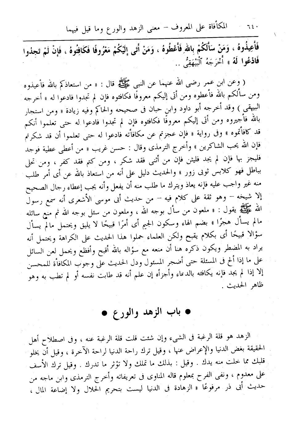 (وَعَنْ ابْنِ عُمَرَ - رَضِيَ اللَّهُ عَنْهُمَا - عَنْ النَّبِيِّ - صَلَّى اللَّهُ عَلَيْهِ وَسَلَّمَ - قَالَ: «مَنْ اسْتَعَاذَكُمْ بِاَللَّهِ فَأَعِيذُوهُ وَمَنْ سَأَلَكُمْ بِاَللَّهِ فَأَعْطُوهُ وَمَنْ أَتَى إلَيْكُمْ مَعْرُوفًا فَكَافِئُوهُ فَإِنْ لَمْ تَجِدُوا فَادْعُوا لَهُ» أَخْرَجَهُ الْبَيْهَقِيُّ) وَقَدْ أَخْرَجَهُ أَبُو دَاوُد وَابْنُ حِبَّانَ فِي صَحِيحِهِ وَالْحَاكِمُ وَفِيهِ زِيَادَةُ «وَمَنْ اسْتَجَارَ بِاَللَّهِ فَأَجِيرُوهُ وَمَنْ أَتَى إلَيْكُمْ مَعْرُوفًا فَكَافِئُوهُ فَإِنْ لَمْ تَجِدُوا فَادْعُوا لَهُ حَتَّى تَعْلَمُوا أَنَّكُمْ قَدْ كَافَأْتُمُوهُ وَفِي رِوَايَةٍ فَإِنْ عَجَزْتُمْ عَنْ مُكَافَأَتِهِ فَادْعُوا لَهُ حَتَّى تَعْلَمُوا أَنْ قَدْ شَكَرْتُمْ فَإِنَّ اللَّهَ يُحِبُّ الشَّاكِرِينَ» وَأَخْرَجَ التِّرْمِذِيُّ وَقَالَ: حَسَنٌ غَرِيبٌ «مَنْ أَعْطَى عَطِيَّةً فَوَجَدَ فَلْيَجْزِ بِهَا فَإِنْ لَمْ يَجِدْ فَلْيُثْنِ فَإِنَّ مَنْ أَثْنَى فَقَدْ شَكَرَ، وَمَنْ كَتَمَ فَقَدْ كَفَرَ، وَمَنْ تَحَلَّى بِبَاطِلٍ فَهُوَ كَلَابِسِ ثَوْبَيْ زُورٍ» وَالْحَدِيثُ دَلِيلٌ عَلَى أَنَّهُ مَنْ اسْتَعَاذَ بِاَللَّهِ عَنْ أَيِّ أَمْرٍ طُلِبَ مِنْهُ غَيْرِ وَاجِبٍ عَلَيْهِ فَإِنَّهُ يُعَاذُ وَيَتْرُكُ مَا طُلِبَ مِنْهُ أَنْ يَفْعَلَ، وَأَنَّهُ يَجِبُ إعْطَاءُ مَنْ سَأَلَ بِاَللَّهِ وَإِنْ كَانَ قَدْ وَرَدَ أَنَّهُ لَا يُسْأَلُ بِاَللَّهِ إلَّا الْجَنَّةُ فَمَنْ سَأَلَ مِنْ الْمَخْلُوقِينَ بِاَللَّهِ شَيْئًا وَجَبَ إعْطَاؤُهُ إلَّا أَنْ يَكُونَ مَنْهِيًّا عَنْ إعْطَائِهِ وَقَدْ أَخْرَجَ الطَّبَرَانِيُّ بِسَنَدٍ رِجَالُهُ رِجَالُ الصَّحِيحِ إلَّا شَيْخَهُ - وَهُوَ ثِقَةٌ عَلَى كَلَامٍ فِيهِ - مِنْ حَدِيثِ أَبِي مُوسَى الْأَشْعَرِيِّ أَنَّهُ سَمِعَ رَسُولَ اللَّهِ - صَلَّى اللَّهُ عَلَيْهِ وَسَلَّمَ - يَقُولُ: «مَلْعُونٌ مَنْ سَأَلَ بِوَجْهِ اللَّهِ. وَمَلْعُونٌ مَنْ سُئِلَ بِوَجْهِ اللَّهِ ثُمَّ مَنَعَ سَائِلَهُ مَا لَمْ يُسْأَلْ هُجْرًا» بِضَمِّ الْهَاءِ وَسُكُونِ الْجِيمِ أَيْ أَمْرًا قَبِيحًا لَا يَلِيقُ وَيَحْتَمِلُ مَا لَمْ يَسْأَلْ سُؤَالًا قَبِيحًا أَيْ بِكَلَامٍ يَقْبُحُ وَلَكِنَّ الْعُلَمَاءَ حَمَلُوا هَذَا الْحَدِيثَ عَلَى الْكَرَاهَةِ وَيَحْتَمِلُ أَنَّهُ يُرَادُ بِهِ الْمُضْطَرُّ، وَيَكُونُ ذِكْرُهُ هُنَا أَنَّ مَنْعَهُ مَعَ سُؤَالِهِ بِاَللَّهِ أَقْبَحُ وَأَفْظَعُ وَيُحْمَلُ لَعْنُ السَّائِلِ عَلَى مَا إذَا أَلَحَّ فِي الْمَسْأَلَةِ حَتَّى أَضْجَرَ الْمَسْئُولَ وَدَلَّ الْحَدِيثُ عَلَى وُجُوبِ الْمُكَافَأَةِ لِلْمُحْسِنِ إلَّا إذَا لَمْ يَجِدْ فَإِنَّهُ يُكَافِئُهُ بِالدُّعَاءِ وَأَجْزَأَهُ إنْ عَلِمَ أَنَّهُ قَدْ طَابَتْ نَفْسُهُ أَوْ لَمْ تَطِبْ بِهِ، وَهُوَ ظَاهِرُ الْحَدِيثِ.