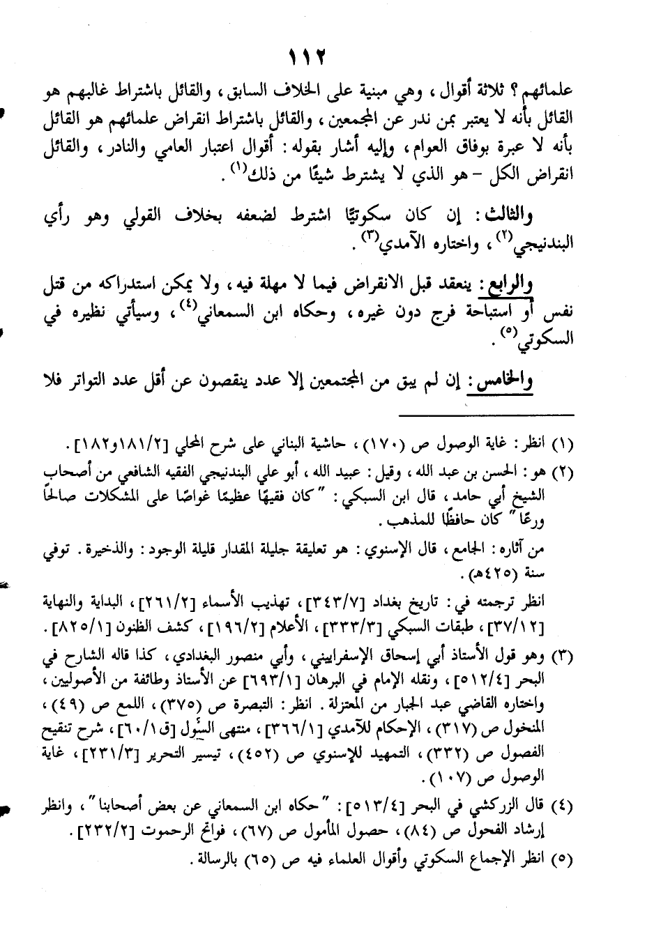 علمائهم؟ ثلاثة أقوال، وهي مبنية على الخلاف السابق، والقائل باشتراط غالبهم هو القائل بأنه لا يعتبر بمن ندر عن المجمعين، والقائل باشتراط انقراض علمائهم هو القائل بأنه لا عبرة بوفاق العوام، وإليه أشار بقوله، أقوال اعتبار العامي والنادر والقائل انقراض الكل ـ هو الذي لا يشترط شيئاً من ذلك.