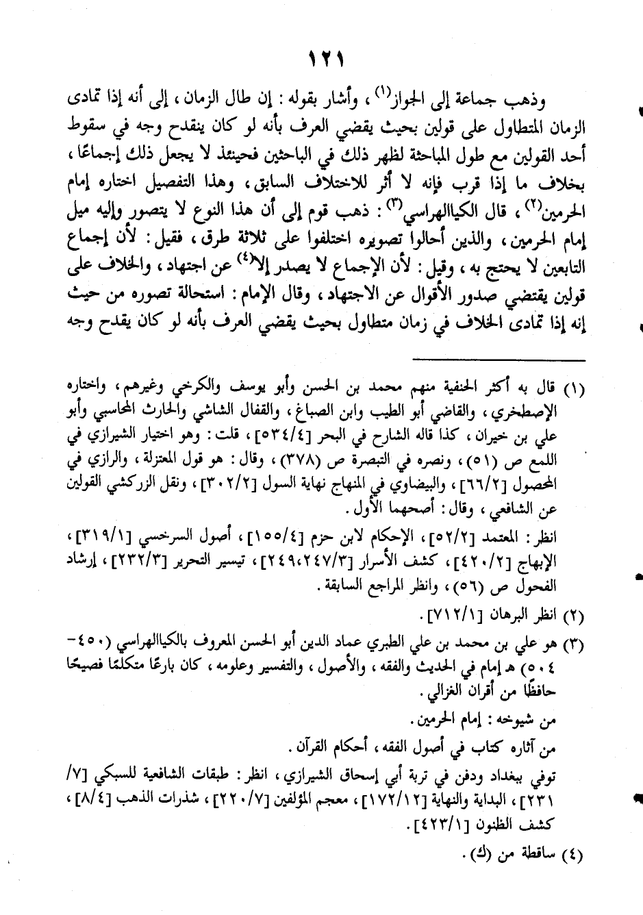 وذهب جماعة إلى الجواز، وأشار بقوله: إن طال الزمان، إلى أنه إذا تمادى الزمان المتطاول على قولين بحيث يقضي العرف بأنه لو كان ينقدح وجه في سقوط أحد القولين مع طول المباحثة لظهر ذلك في الباحثين فحينئذ لا يجعل ذلك إجماعاً، بخلاف ما إذا قرب فإنه لا أثر للاختلاف السابق، وهذا التفصيل اختاره إمام الحرمين، قال الكياالهراسي: ذهب قوم إلى أن هذا النوع لا يتصور وإليه ميل إمام الحرمين، والذين أحالوا تصويره اختلفوا على ثلاثة طرق، فقيل: لأن إجماع التابعين لا يحتج به، وقيل: لأن الإجماع لا يصدر إلا عن اجتهاد، والخلاف على قولين يقتضي صدور الأقوال عن الاجتهاد، وقال الإمام: استحالة تصوره من حيث إنه إذا تمادى الخلاف في زمان متطاول بحيث يقضي العرف بأنه لو كان يقدح وجه