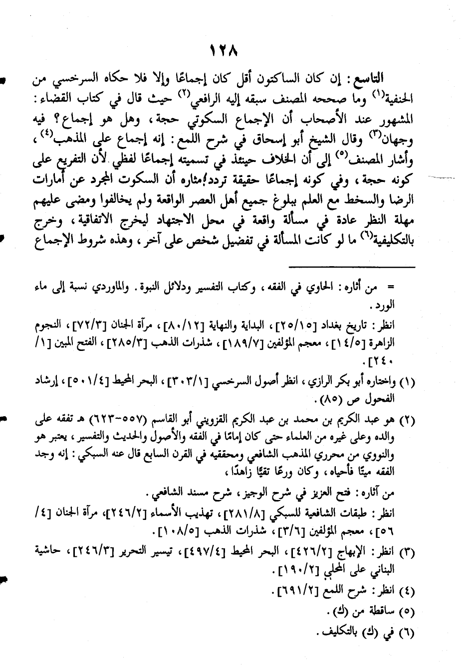 التاسع: إن كان الساكتون أقل كان إجماعاً وإلا فلا حكاه السرخسي من الحنفية وما صححه المصنف سبقه إليه الرافعي، حيث قال في كتاب القضاء: المشهور عند الأصحاب أن الإجماع السكوتي حجة، وهل هو إجماع؟ فيه وجهان وقال الشيخ أبو إسحاق في شرح (اللمع): إنه إجماع على المذهب، وأشار المصنف إلى أن الخلاف حينئذ في تسميته إجماعاً لفظي لأن التفريع على كونه حجة، وفي كونه إجماعاً حقيقة تردد مثاره أن السكوت المجرد عن أمارات الرضا والسخط مع العلم ببلوغ جميع أهل العصر الواقعة ولم يخالفوا ومضى عليهم مهلة النظر عادة في مسألة واقعة في محل الاجتهاد ليخرج الاتفاقية، وخرج بالتكليفية، ما لو كانت المسألة في تفضيل شخص على آخر، وهذه شروط الإجماع