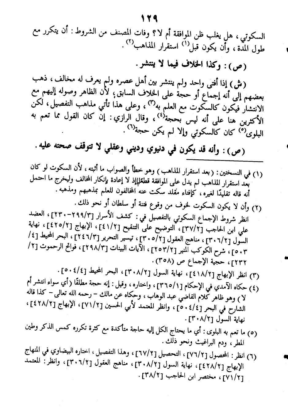 (ش): إذا أفتى واحد ولم ينتشر بين أهل عصره ولم يعرف له مخالف، ذهب بعضهم إلى أنه إجماع أو حجة على الخلاف السابق، لأن الظاهر وصوله إليهم مع الانتشار فيكون كالسكوت مع العلم به، وعلى هذا تأتي مذاهب التفصيل، لكن الأكثرين، هنا على أنه ليس بحجة، وقال الرازي: إن كان القول مما تعم به البلوى كان كالسكوتي وإلا لم يكن حجة.