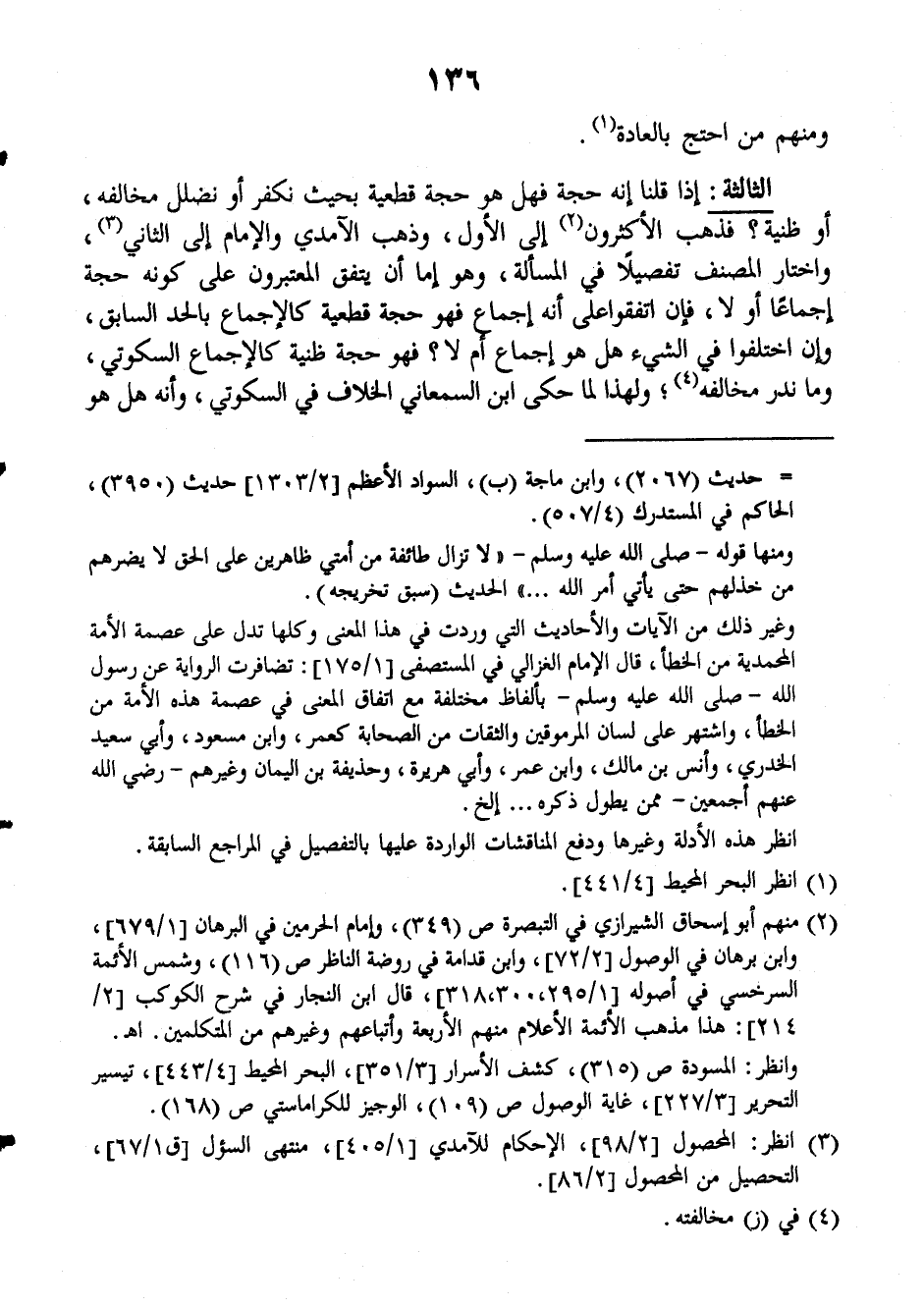 الثالثة: إذا قلنا إنه حجة فهل هو حجة قطعية بحيث نكفر أو نضلل مخالفه، أو ظنية؟ فذهب الأكثرون إلى الأول، وذهب الآمدي والإمام إلى الثاني، واختار المصنف تفصيلاً في المسألة، وهو إما أن يتفق المعتبرون على كونه حجة إجماعاً أو لا، فإن اتفقوا على أنه إجماع فهو حجة قطعية كالإجماع بالحد السابق، وإن اختلفوا في الشيء هل هو إجماع أم لا؟ فهو حجة ظنية كالإجماع السكوتي، وما ندر مخالفه ولهذا لما حكى ابن السمعاني الخلاف في السكوتي، وأنه هل هو