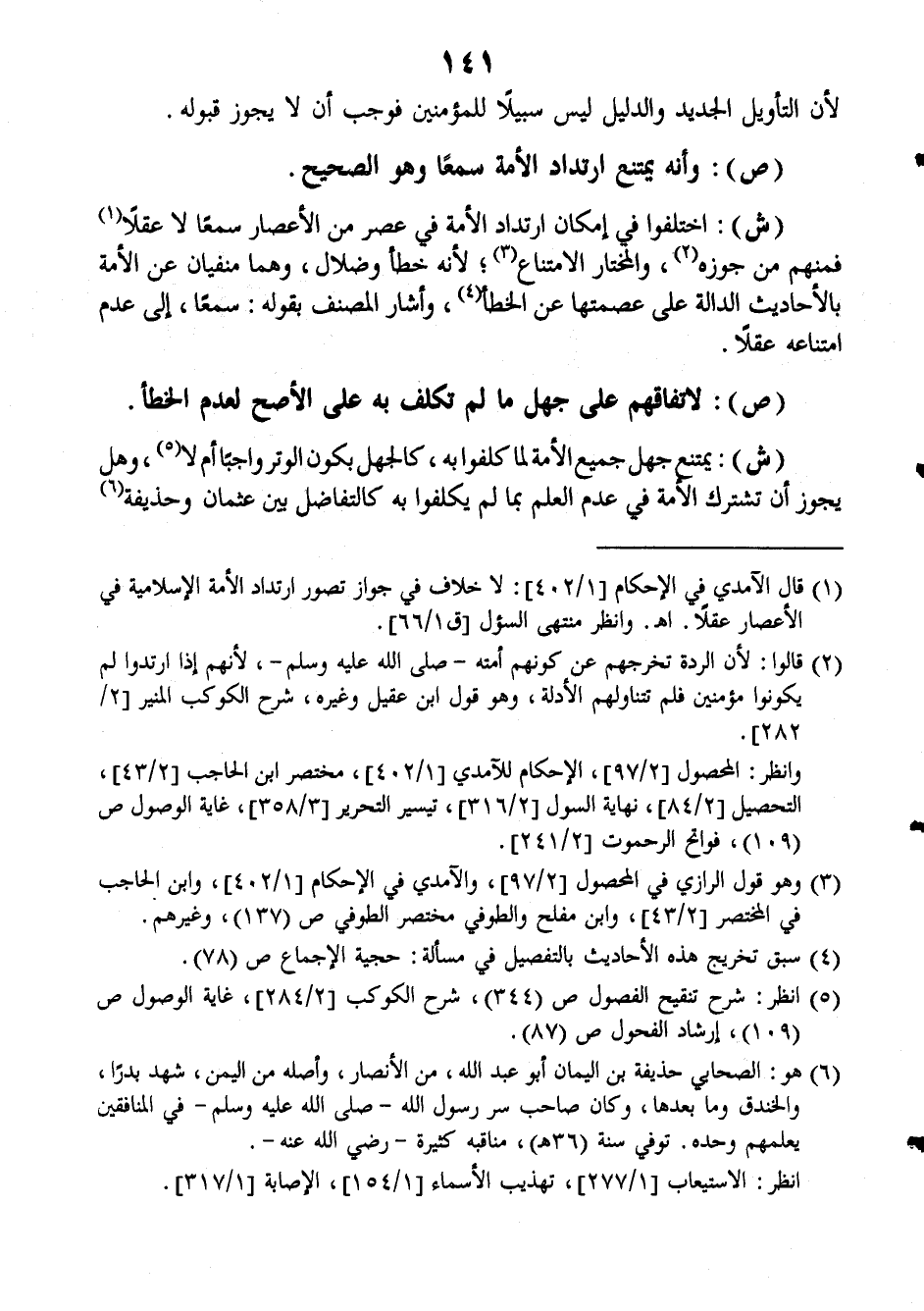 (ش): اختلفوا في إمكان ارتداد الأمة في عصر من الأعصار سمعاً لا عقلاً فمنهم من جوزه، والمختار الامتناع، لأنه خطأ وضلال، وهما منفيان عن الأمة بالأحاديث الدالة على عصمتها عن الخطأ، وأشار المصنف بقوله: سمعاً، إلى عدم امتناعه عقلاً.
