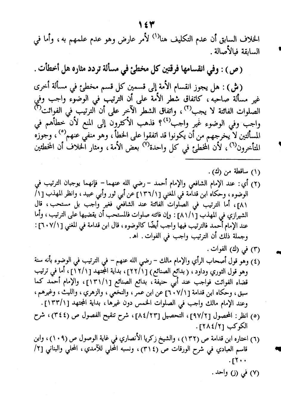 (ش): هل يجوز انقسام الأمة إلى قسمين كل قسم مخطئ في مسألة أخرى غير مسألة صاحبه، كاتفاق شطر الأمة على أن الترتيب في الوضوء واجب وفي الصلوات الفائتة لا يجب، واتفاق الشطر الآخر على أن الترتيب في الفوائت واجب وفي الوضوء غير واجب؟ فذهب الأكثرون إلى المنع لأن خطأهم في المسألتين لا يخرجهم من أن يكونوا قد اتفقوا على الخطأ، وهو منفي عنهم وجوزه المتأخرون، لأن المخطئ في كل واحدة، بعض الأمة، ومثار الخلاف أن المخطئين