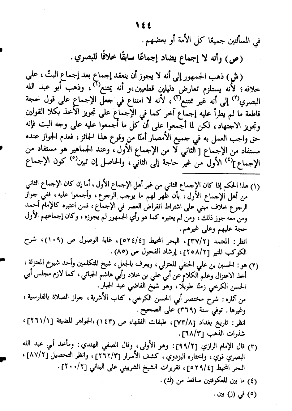(ش): ذهب الجمهور إلى أنه لا يجوز أن ينعقد إجماع بعد إجماع البت، على خلافه، لأنه يستلزم تعارض دليلين قطعيين، وأنه يمتنع، وذهب أبو عبد الله البصري إلى أنه غير ممتنع، لأنه لا امتناع في جعل الإجماع على قول حجة قاطعة ما لم يطرأ عليه إجماع آخر كما في الإجماع على تجويز الأخذ بكلا القولين وتجويز الاجتهاد، لكن لما أجمعوا على أن كل ما أجمعوا عليه على وجه البت فإنه حق واجب العمل به في جميع الأمصار أمناً من وقوع هذا الجائز، فعدم الجواز عنده مستفاد من الإجماع الثاني لا من الإجماع الأول، وعند الجماهير هو مستفاد من الإجماع الأول من غير حاجة إلى الثاني، والحاصل إن تبين كون الإجماع