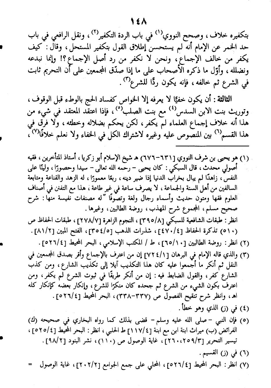 الثالثة: أن يكون خفياً لا يعرفه إلا الخواص كفساد الحج بالوطء قبل الوقوف، وتوريث بنت الابن السدس مع بنت الصلب فإذا اعتقد المعتقد في شيء من هذا أنه خلاف إجماع العلماء لم يكفر، لكن يحكم بضلاله وخطئه، ولا فرق في هذا القسم بين المنصوص عليه وغيره لاشتراك الكل في الخفاء ولا نعلم خلافاً،