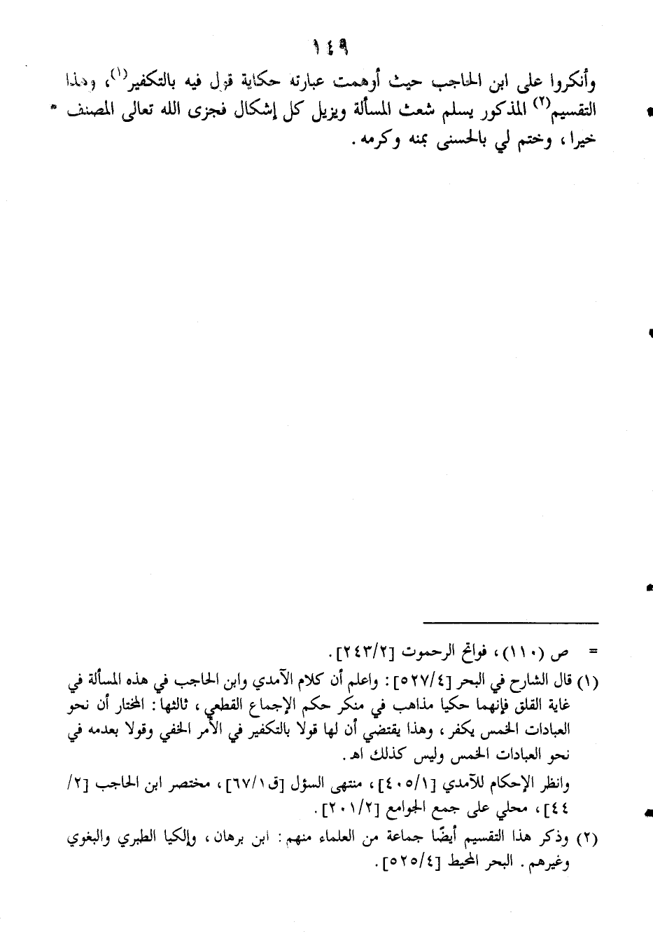 وأنكروا على ابن الحاجب حيث أوهمت عبارته حكاية قول فيه بالتكفير وهذا التقسيم المذكور يسلم شعث المسألة ويزيل كل إشكال فجزى الله تعالى المصنف خيراً، وختم لي بالحسنى بمنه وكرمه.