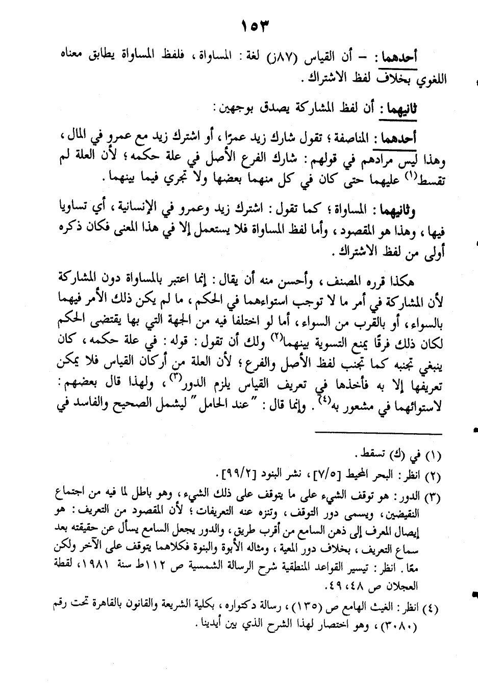 وثانيهما: المساواة، كما تقول: اشترك زيد وعمرو في الإنسانية، أي تساويا فيها، وهذا هو المقصود، وأما لفظ المساواة فلا يستعمل إلا في هذا المعنى فكان ذكره أولى من لفظ الاشتراك.