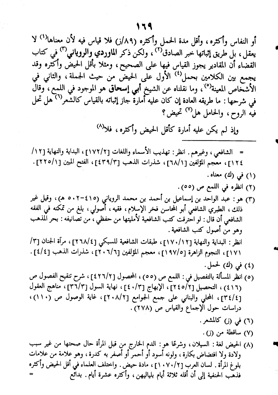 أو النفاس وأكثره، وأقل مدة الحمل وأكثره (٨٩/ز) فلا قياس فيه لأن معناها لا يعقل، بل طريق إثباتها خبر الصادق، ولكن ذكر الماوردي والروياني في كتاب القضاء أن المقادير يجوز القياس فيها على الصحيح، ومثلا بأقل الحيض وأكثره وقد يجمع بين الكلامين بحمل الأول على الحيض من حيث الجملة، والثاني في الأشخاص المعينة، وما نقلناه عن الشيخ أبي إسحاق هو الموجود في (اللمع)، وقال في شرحها: ما طريقه العادة إن كان عليه أمارة جاز إثباته بالقياس كالشعر هل تحل فيه الروح، والحامل هل تحيض؟