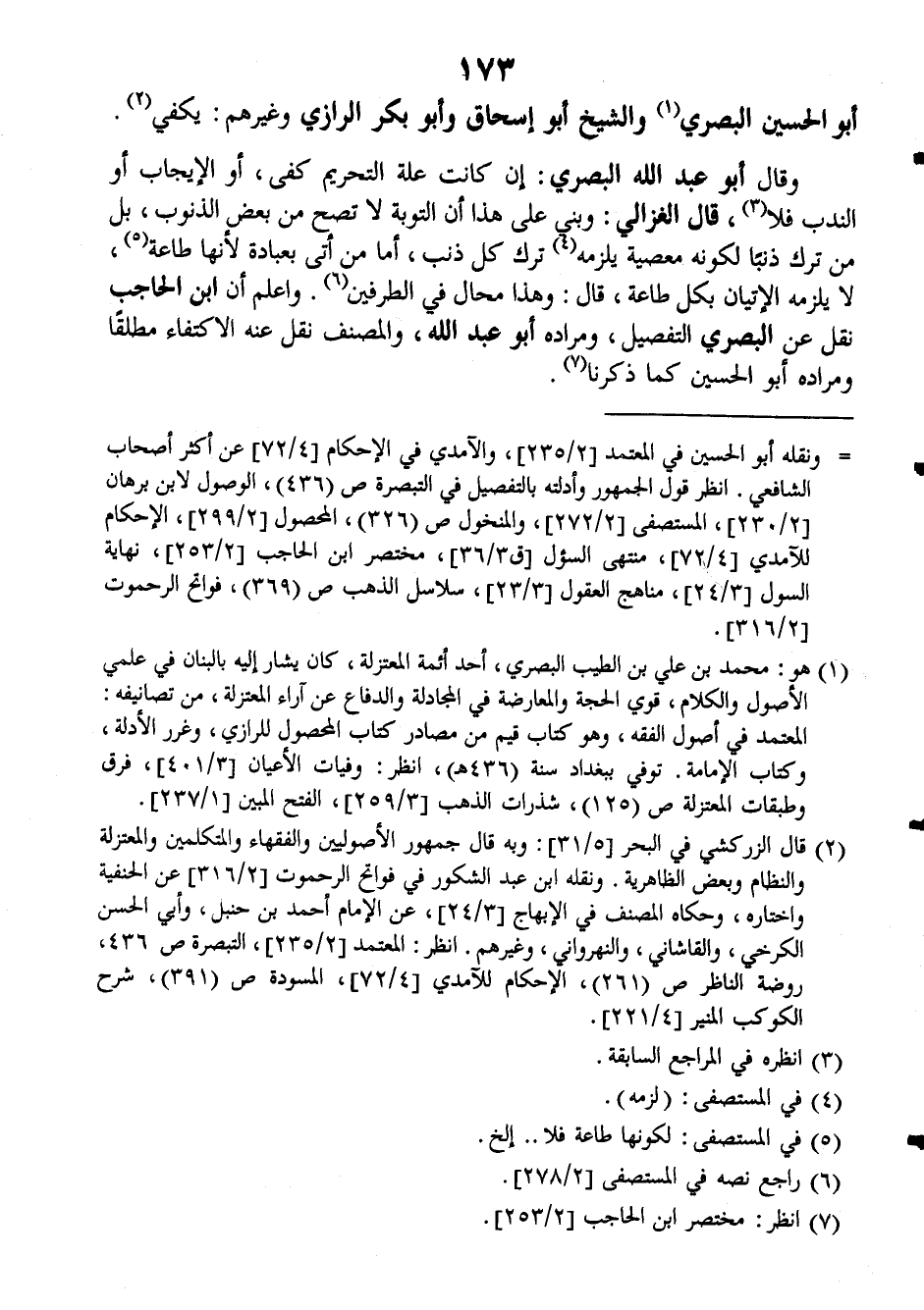 وقال أبو عبد الله البصري: إن كانت علة التحريم كفى، أو الإيجاب أو الندب فلا، قال الغزالي: وبني على هذا أن التوبة لا تصح من بعض الذنوب، بل من ترك ذنباً لكونه معصية يلزمه، ترك كل ذنب، أما من أتى بعبادة لأنها طاعة، لا يلزمه الإتيان بكل طاعة، قال: وهذا محال في الطرفين، واعلم أن ابن الحاجب نقل عن البصري التفصيل، ومراده أبو عبد الله، والمصنف نقل عنه الاكتفاء مطلقاً ومراده أبو الحسين كما ذكرنا.