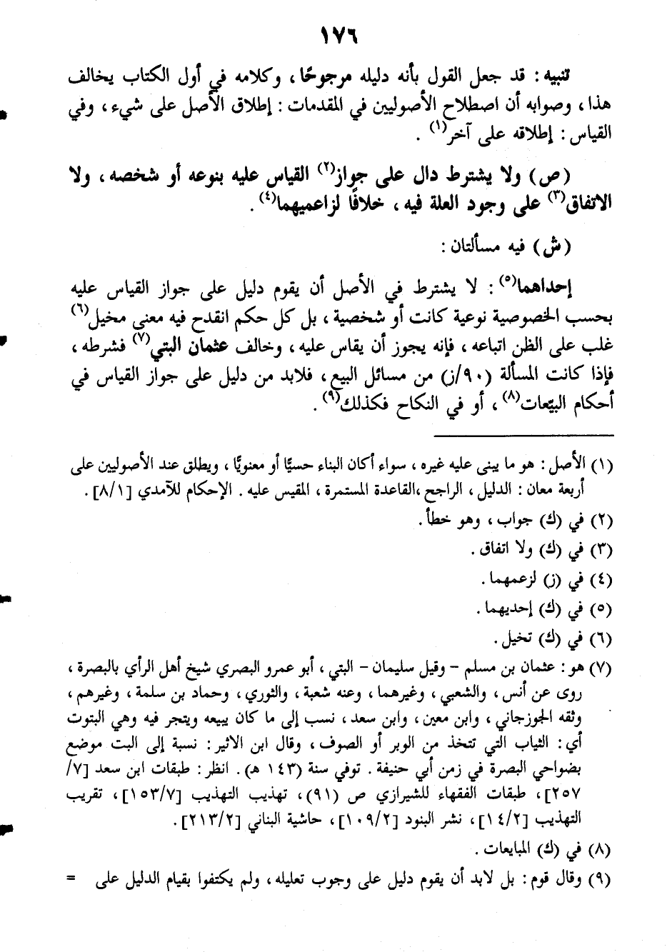 إحداهما: لا يشترط في الأصل أن يقوم دليل على جواز القياس عليه بحسب الخصوصية نوعية كانت أو شخصية، بل كل حكم انقدح فيه معنى مخيل غلب على الظن اتباعه، فإنه يجوز أن يقاس عليه، وخالف عثمان البتي فشرطه، فإذا كانت المسألة (٩٠/ز) من مسائل البيع، فلا بد من دليل على جواز القياس في أحكام البيعات أو في النكاح فكذلك.