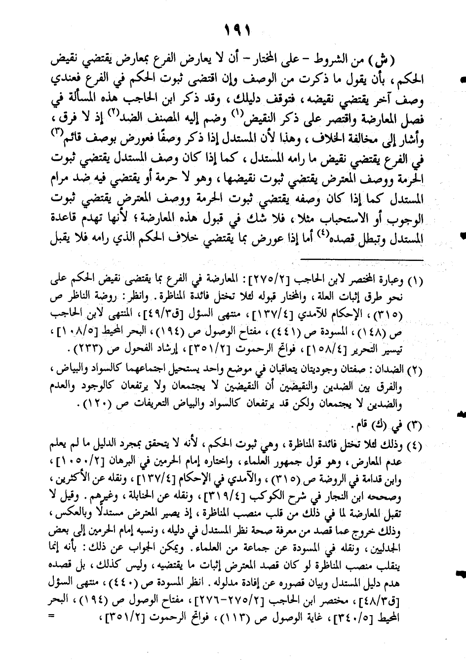 (ش): من الشروط ـ على المختار ـ أن لا يعارض الفرع بمعارض يقتضي نقيض الحكم، بأن يقول ما ذكرت من الوصف وإن اقتضى ثبوت الحكم في الفرع فعندي وصف آخر يقتضي نقيضه، فتوقف دليلك، وقد ذكر ابن الحاجب هذه المسألة في فصل المعارضة واقتصر على ذكر النقيض، وضم إليه المصنف الضد، إذ لا فرق، وأشار إلى مخالفة الخلاف، وهذا لأن المستدل إذا ذكر وصفاً فعورض بوصف قائم في الفرع يقتضي نقيض ما رامه المستدل، كما إذا كان وصف المستدل يقتضي ثبوت الحرمة ووصف المعترض يقتضي ثبوت نقيضها، وهو لا حرمة أو يقتضي فيه ضد مرام المستدل كما إذا كان وصفه يقتضي ثبوت الحرمة ووصف المعترض يقتضي ثبوت الوجوب أو الاستحباب مثلاً، فلا شك في قبول هذه المعارضة، لأنها تهدم قاعدة المستدل وتبطل قصده أما إذا عورض، بما يقتضي خلاف الحكم الذي رامه فلا يقبل