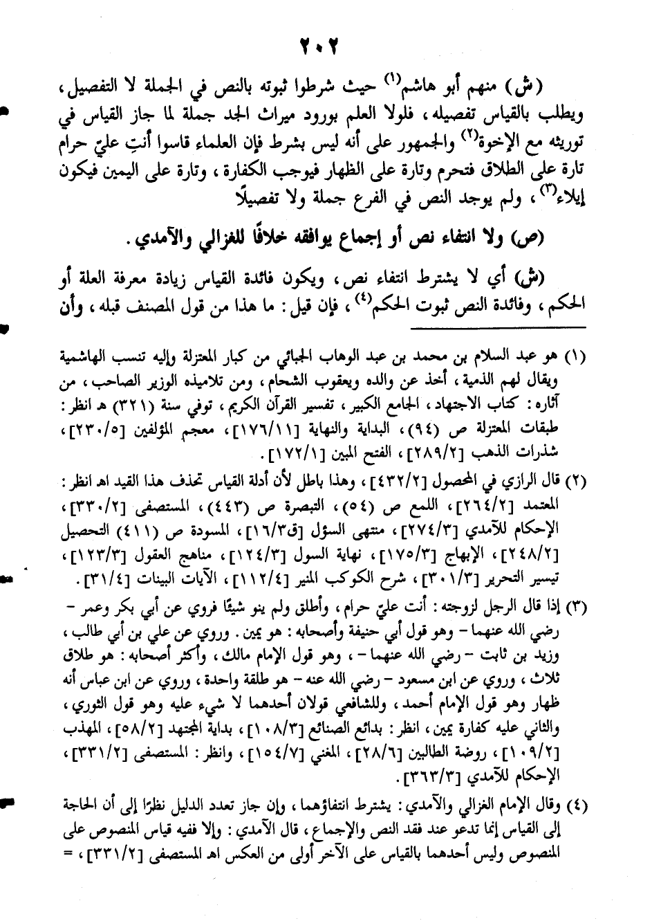 (ش): منهم أبو هاشم حيث شرطوا ثبوته بالنص في الجملة لا التفصيل، ويطلب بالقياس تفصيله، فلولا العلم بورود ميراث الجد جملة لما جاز القياس في توريثه مع الإخوة والجمهور على أنه ليس بشرط فإن العلماء قاسوا أنت علي حرام تارة على الطلاق فتحرم وتارة على الظهار فيوجب الكفارة، وتارة على اليمين فيكون إيلاء، ولم يوجد النص في الفرع جملة ولا تفصيلاً.
